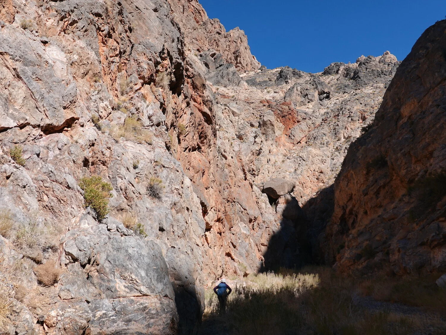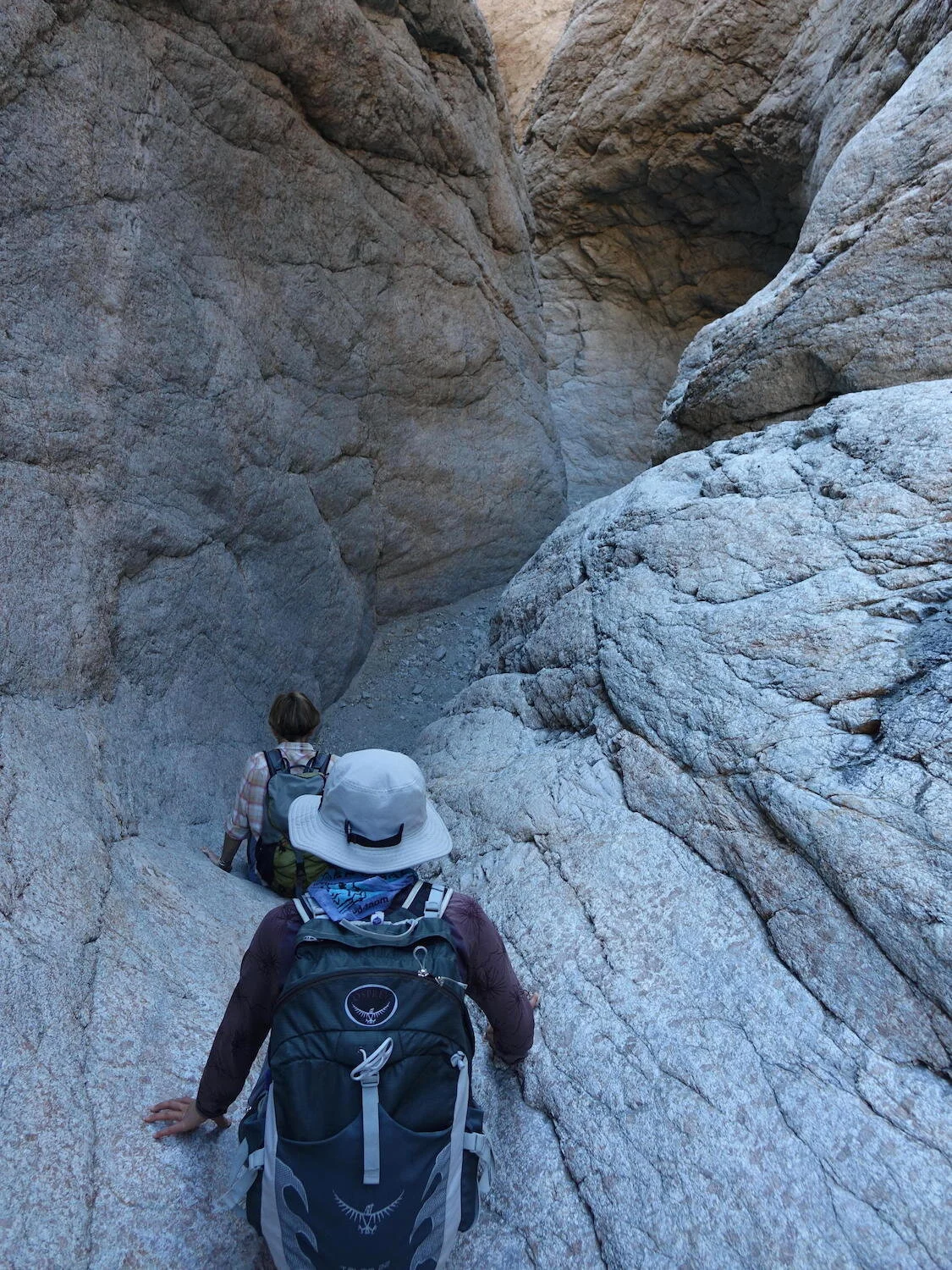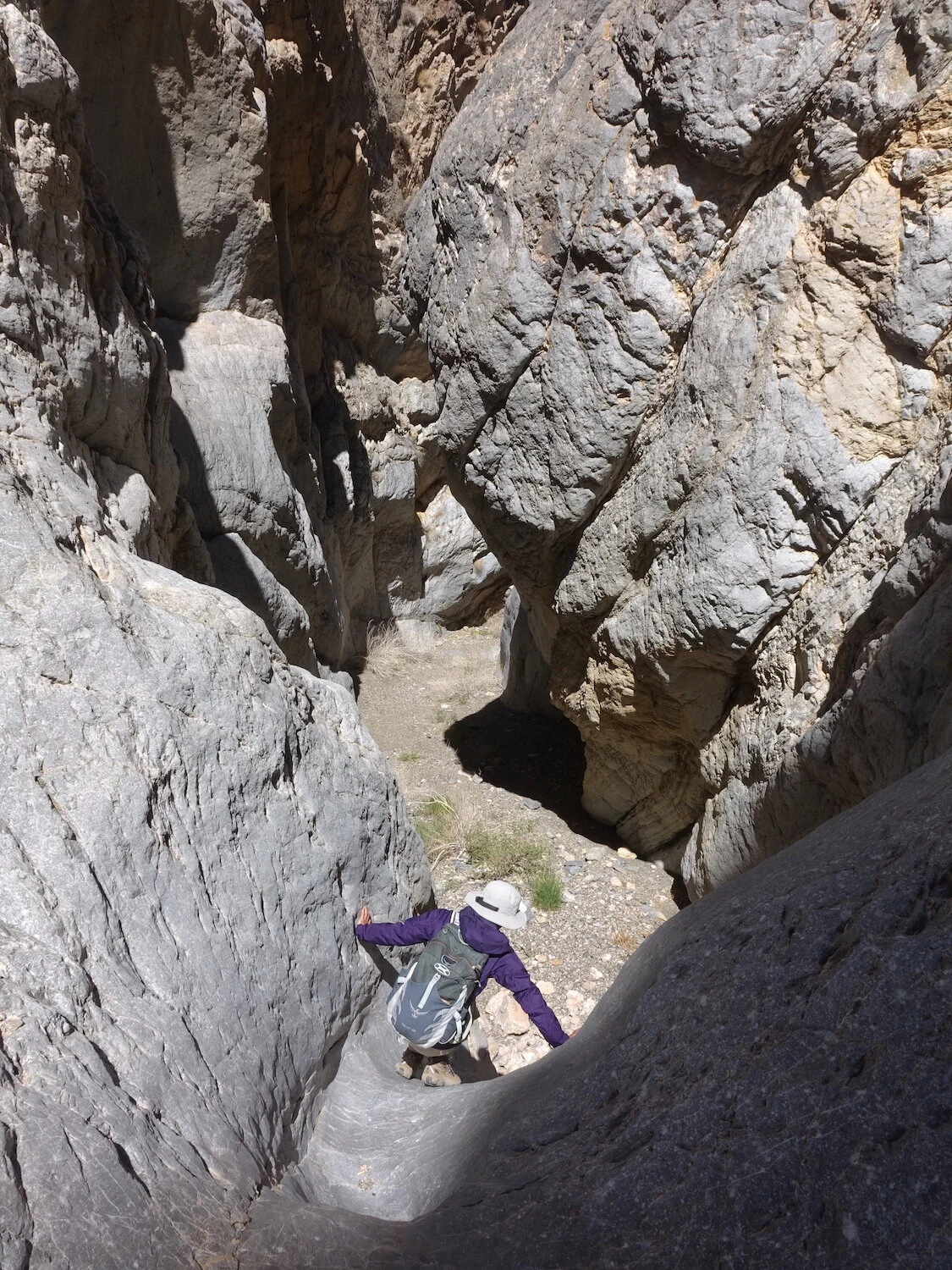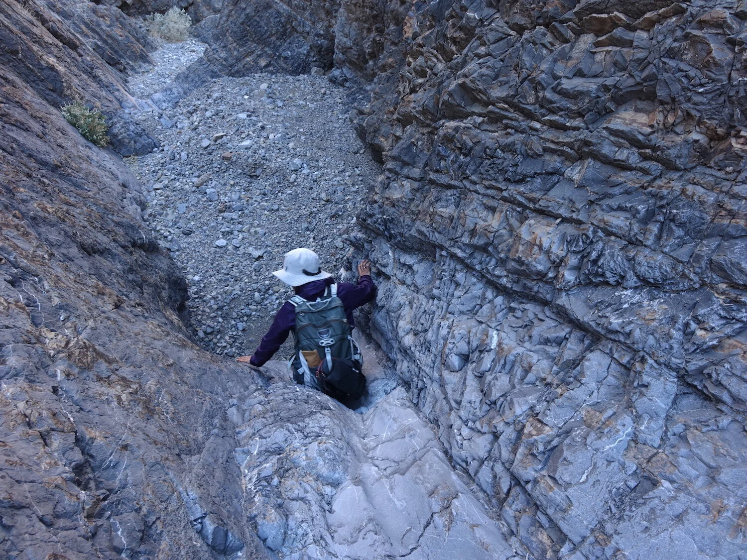 Junko scrambling down a dryfall in the Cottonwood Mountains