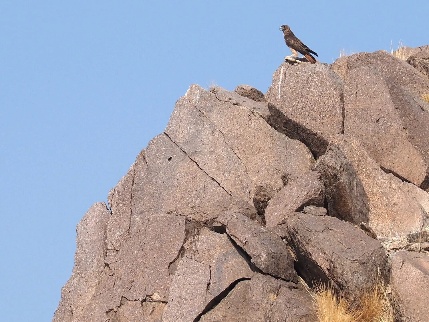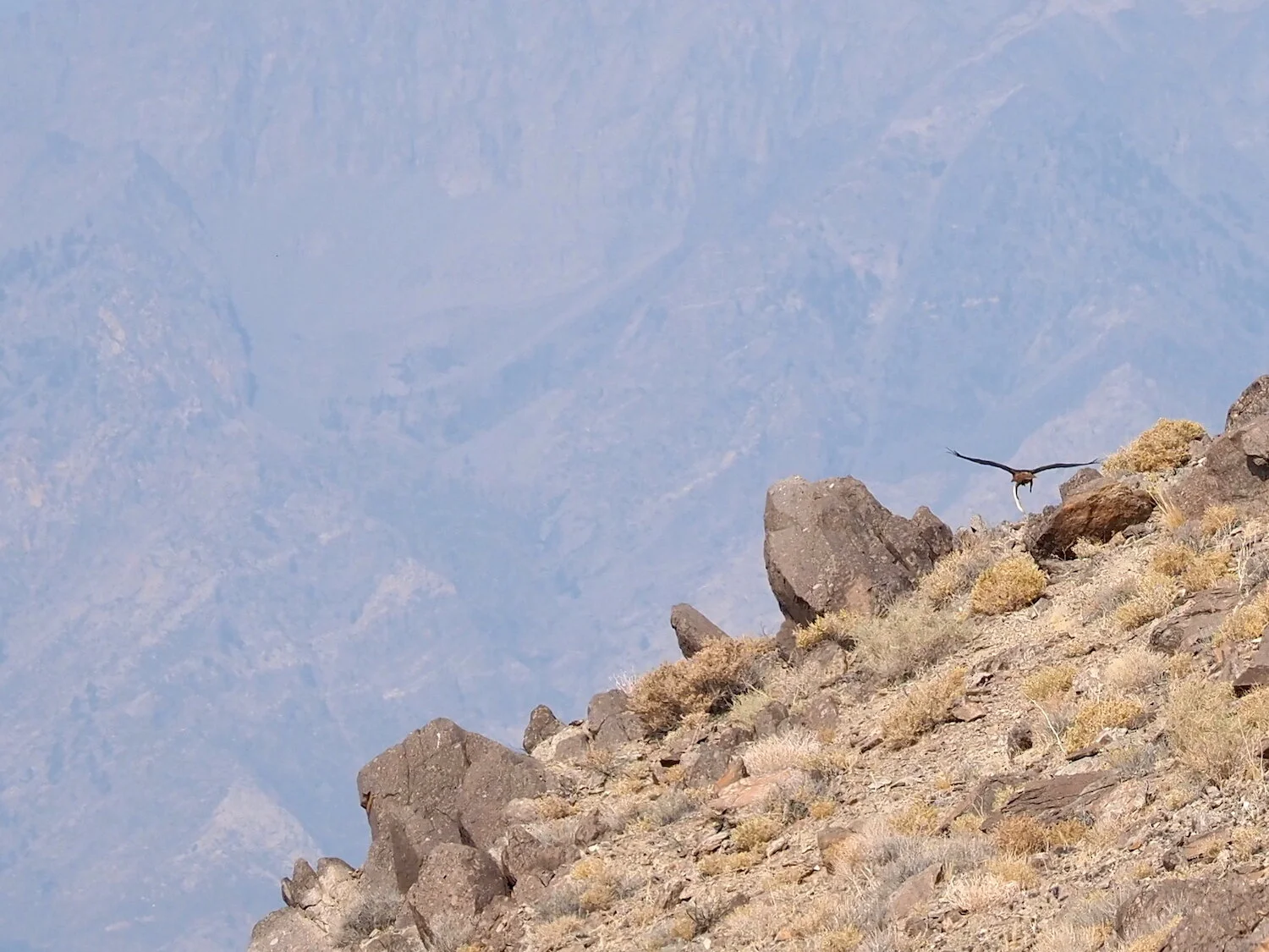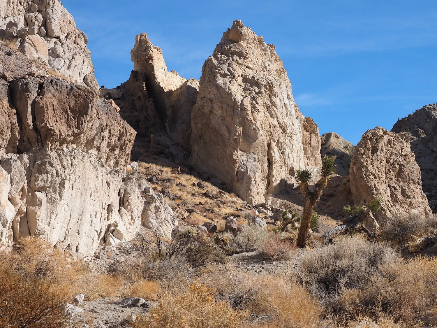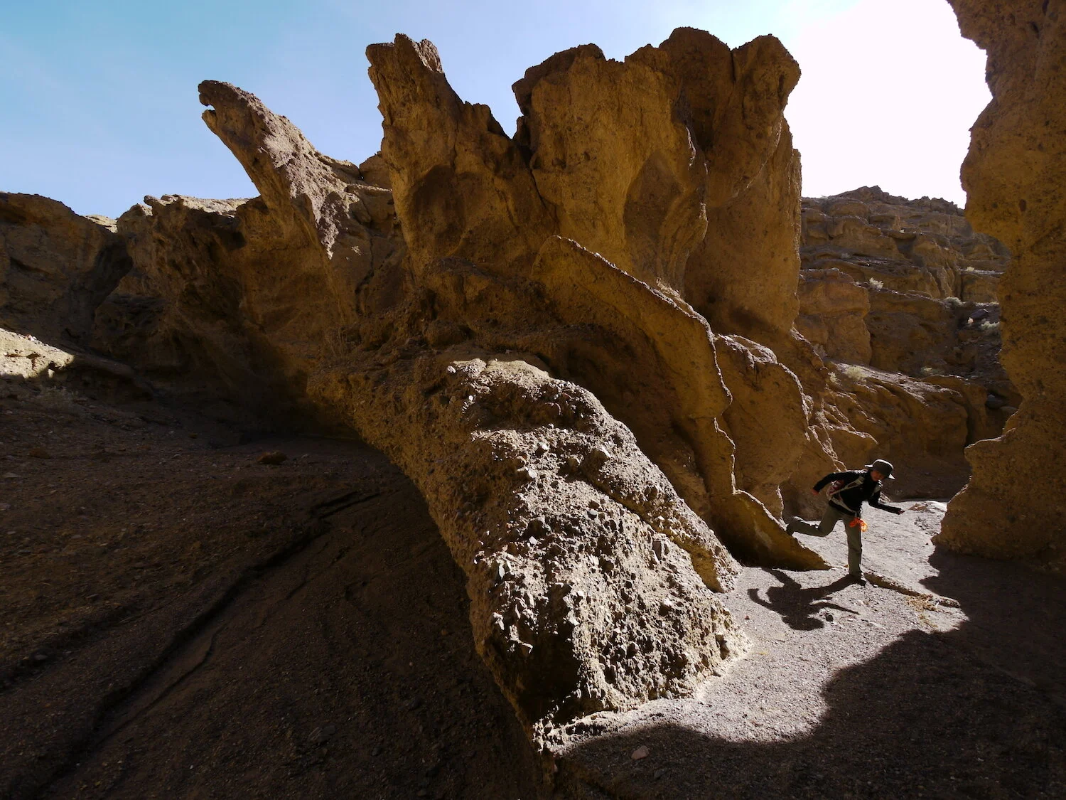 Junko scrambling down a dryfall in the Cottonwood Mountains
