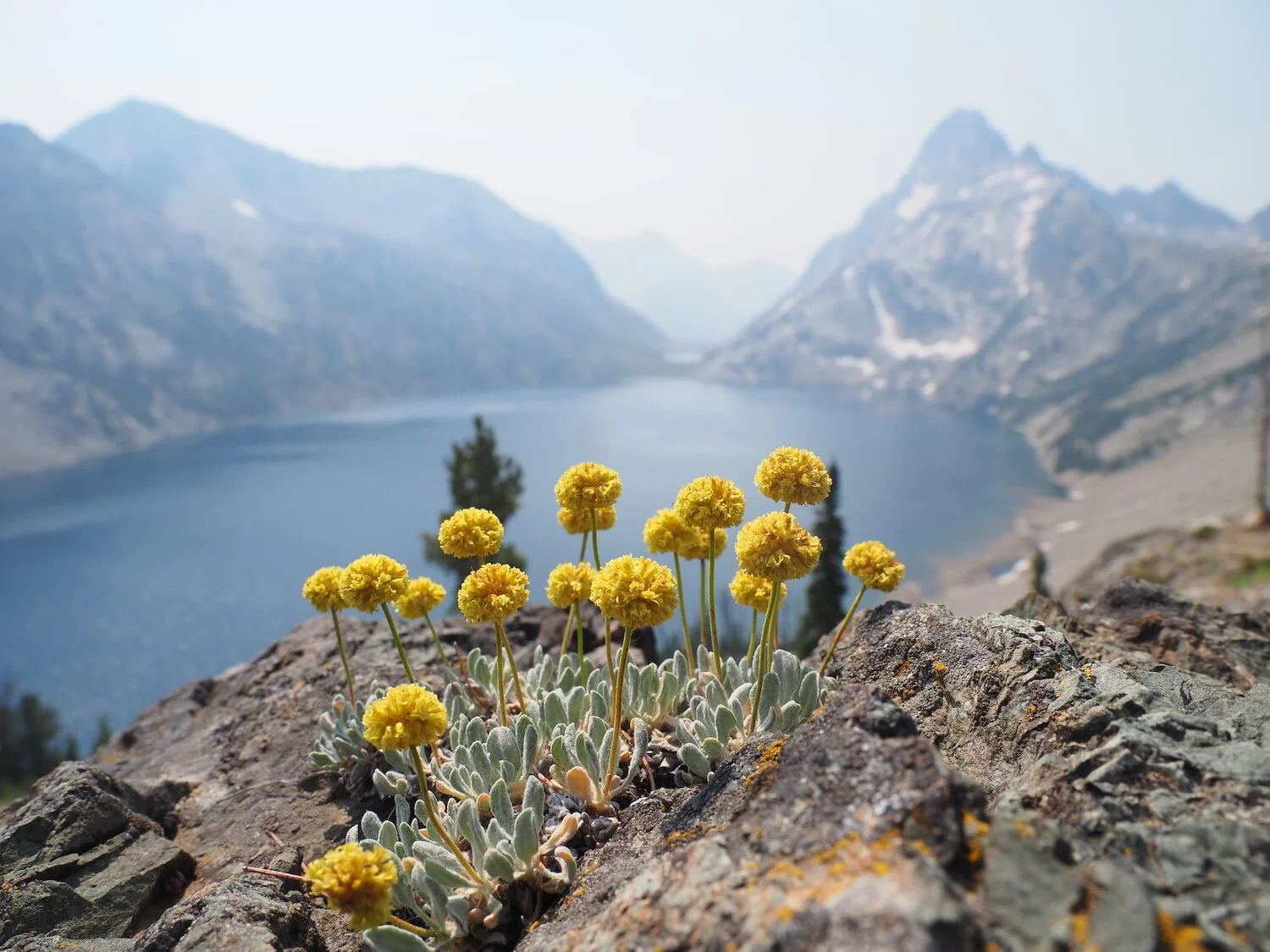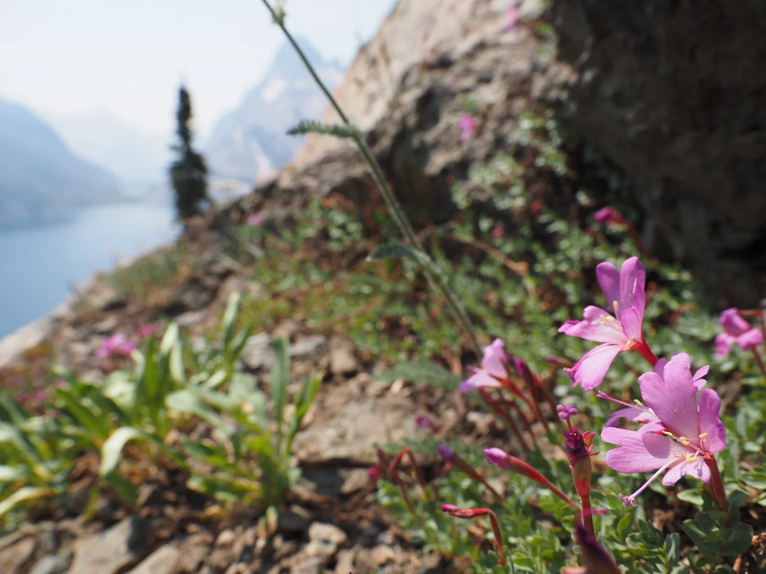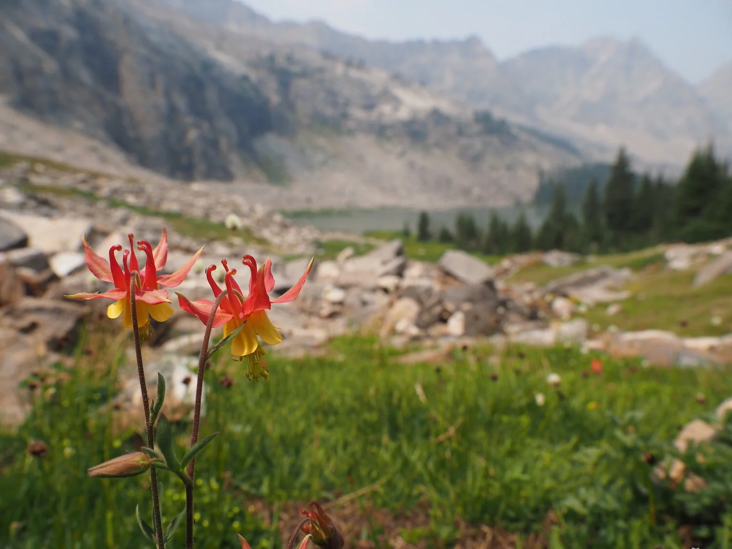 Sawtooth Lake flowers / Smoke from early summer fire / Rocky ledge with view