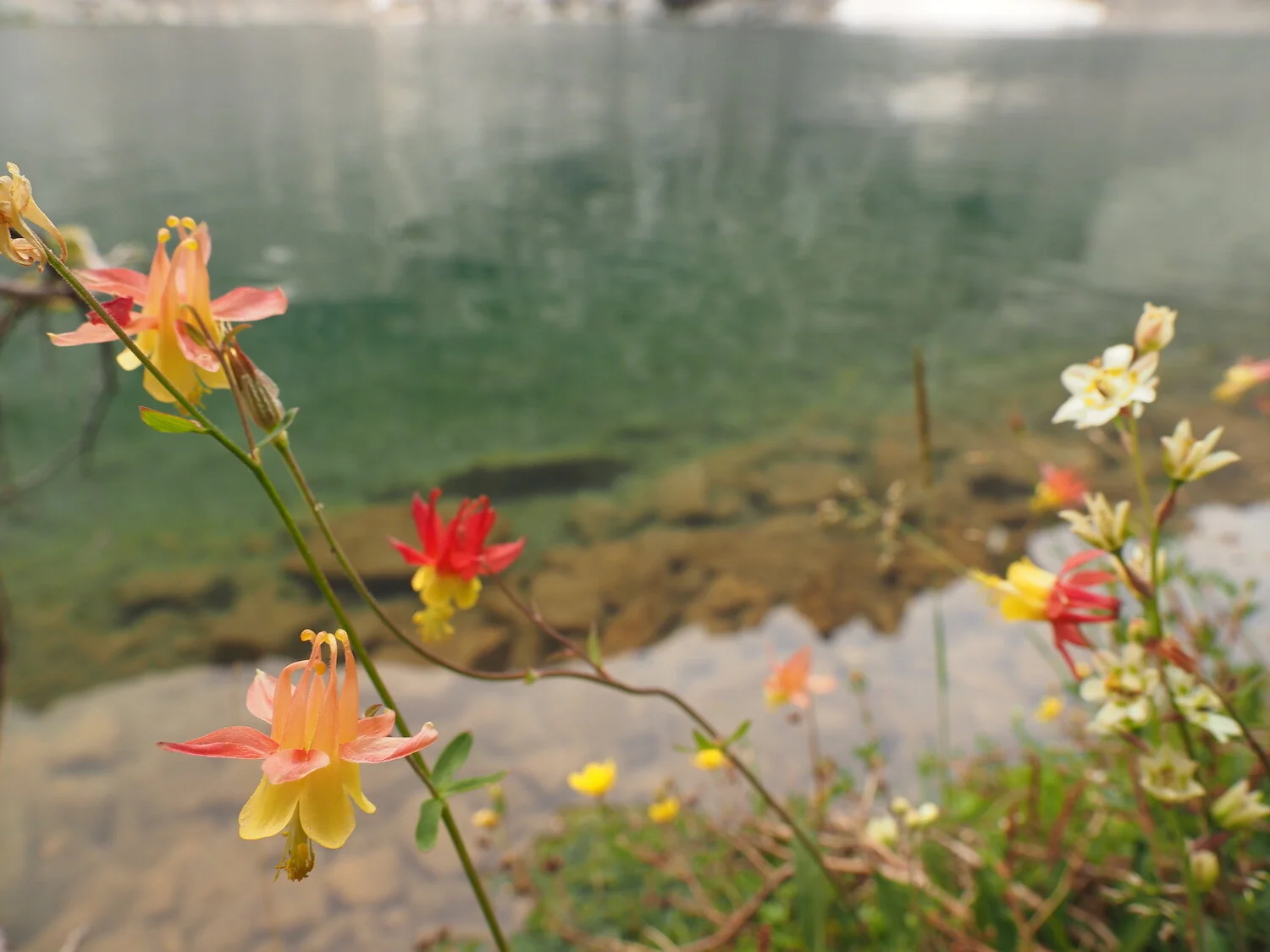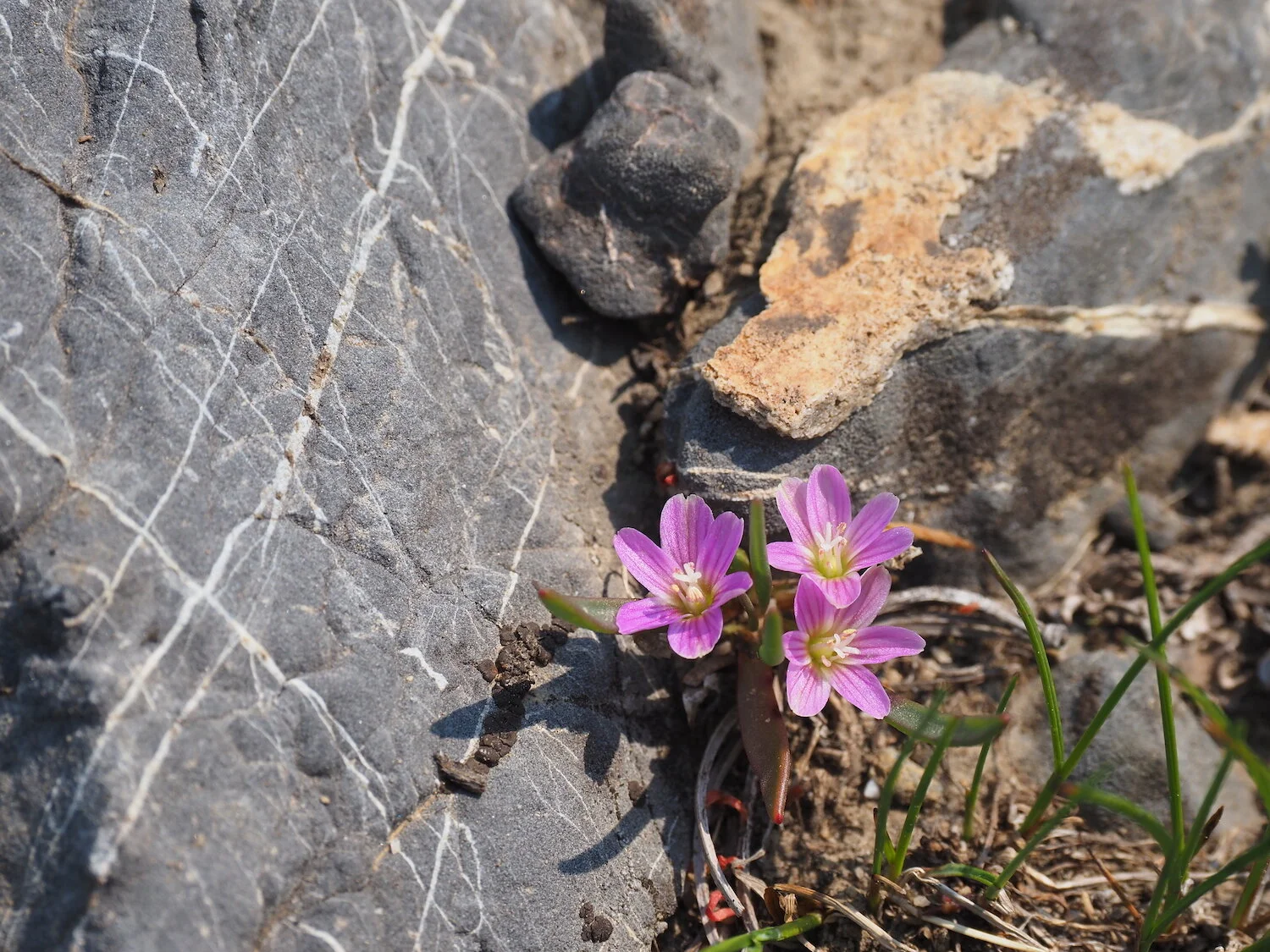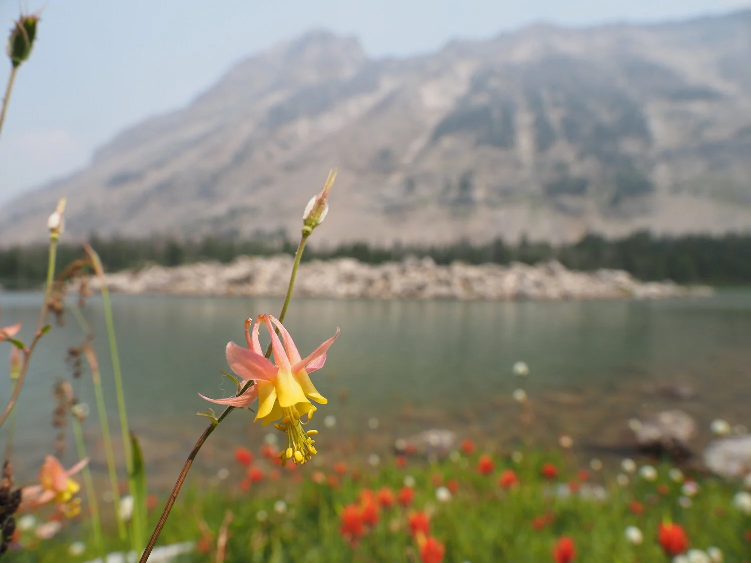 Sawtooth Lake flowers / Smoke from early summer fire / Rocky ledge with view