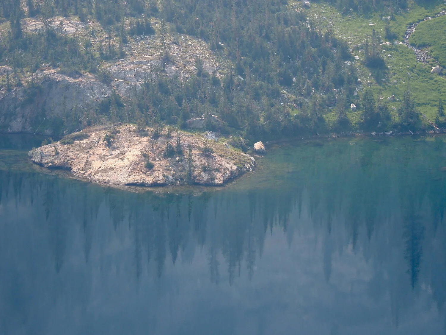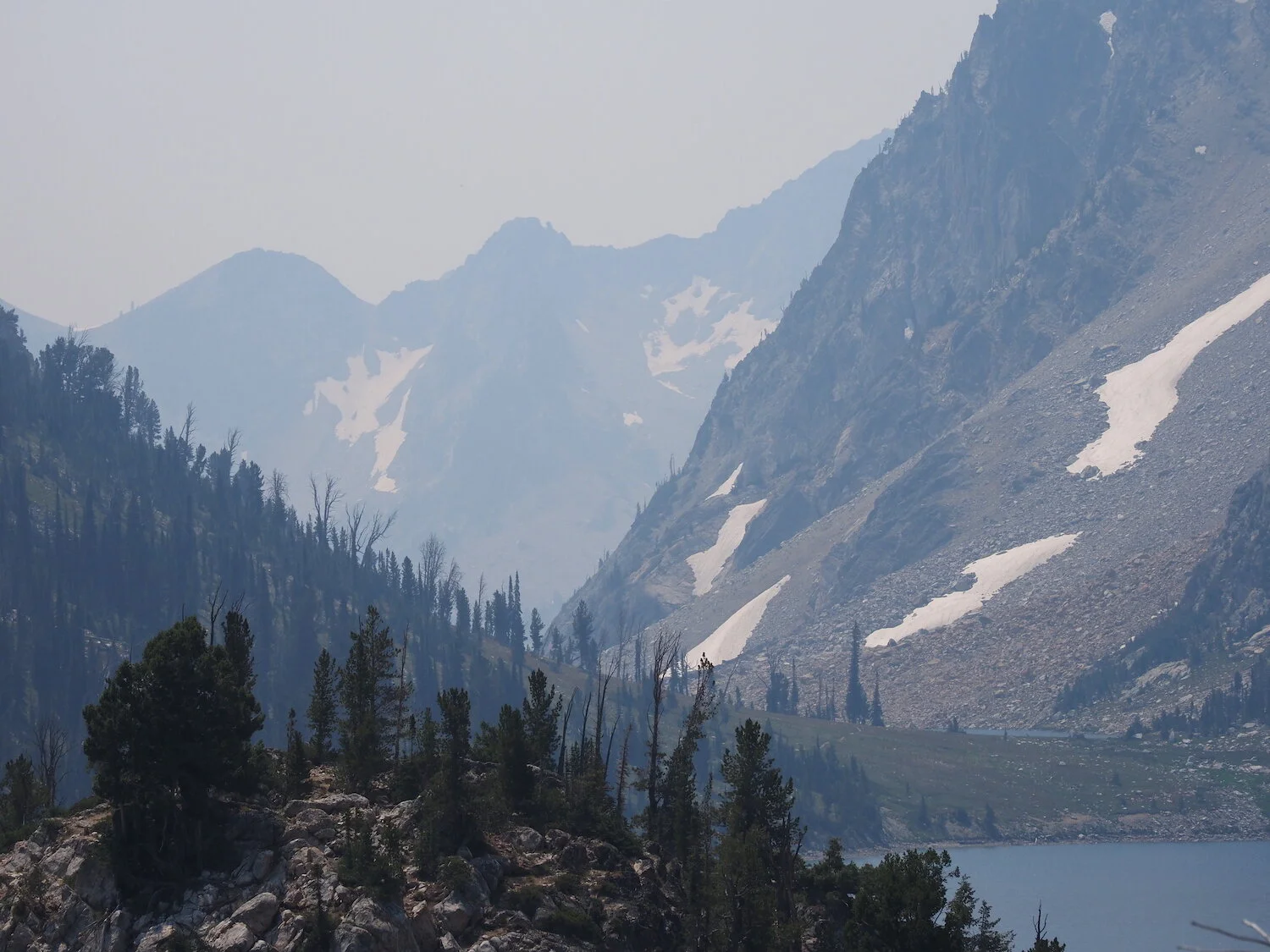 Alpine Lake mirror / Smoke and trees blend still water / Just a mile to go