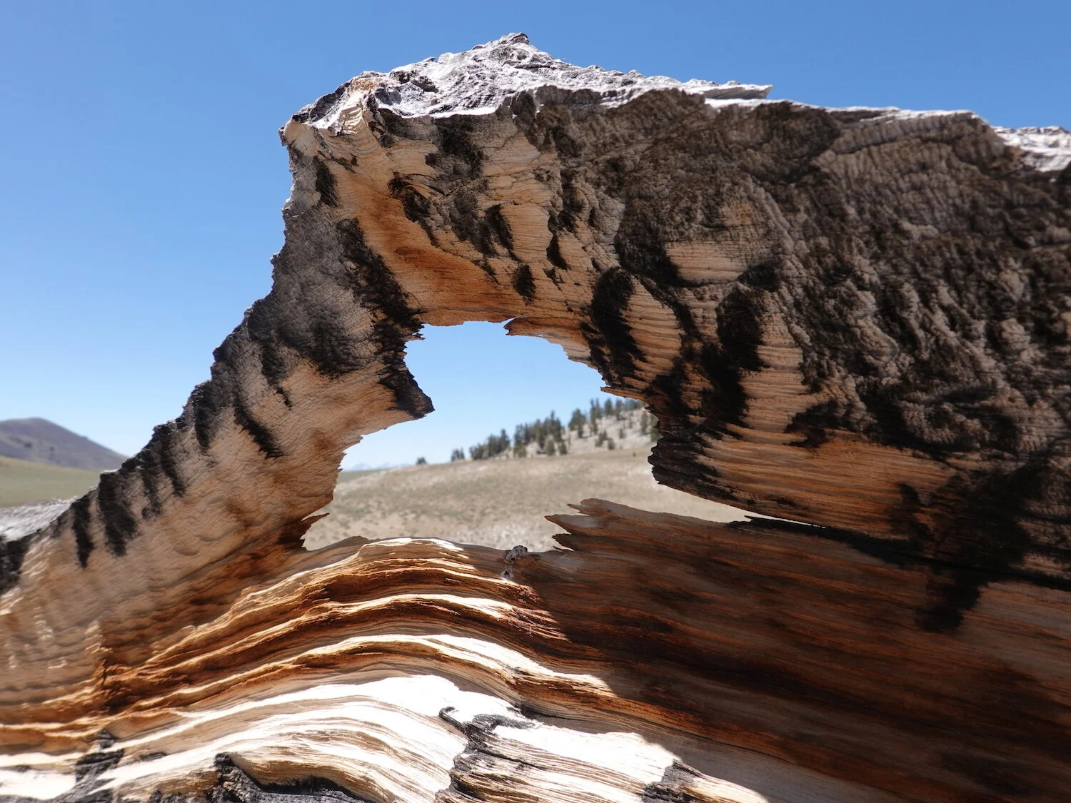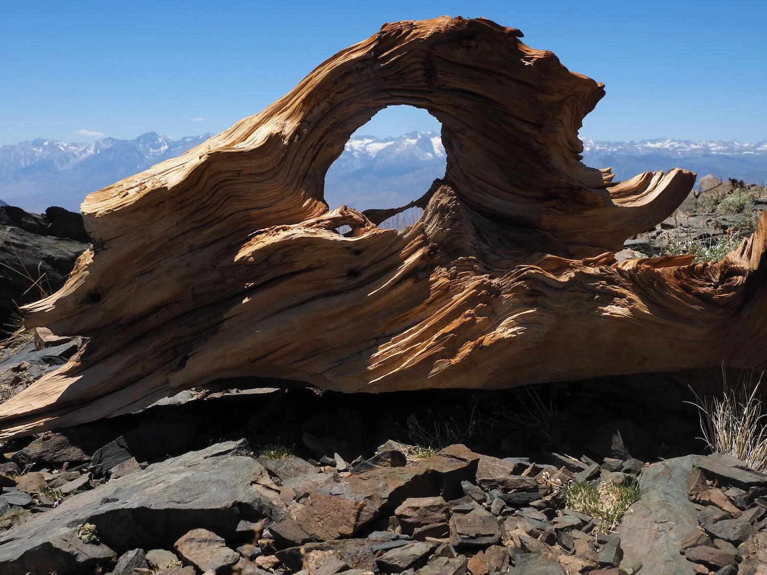 Bristlecone stump arch / on top of the White Mountains / and the Palisades