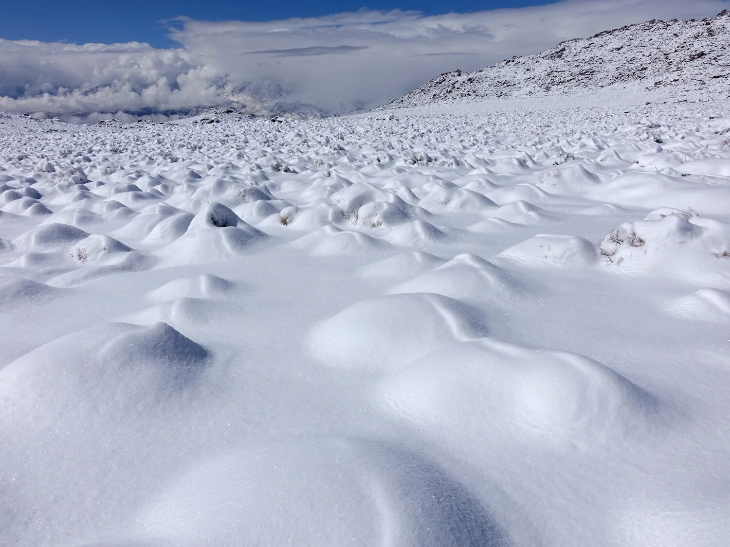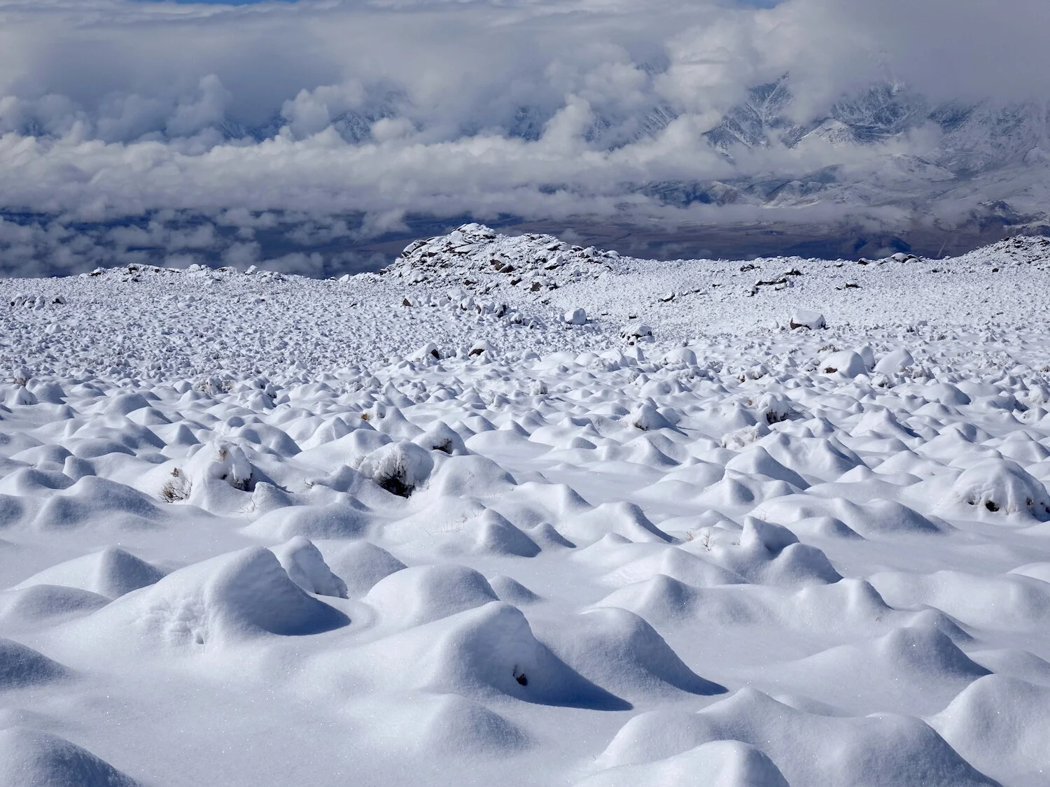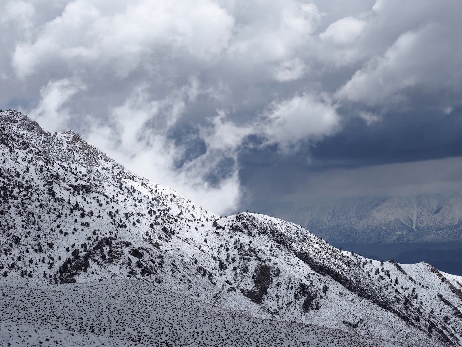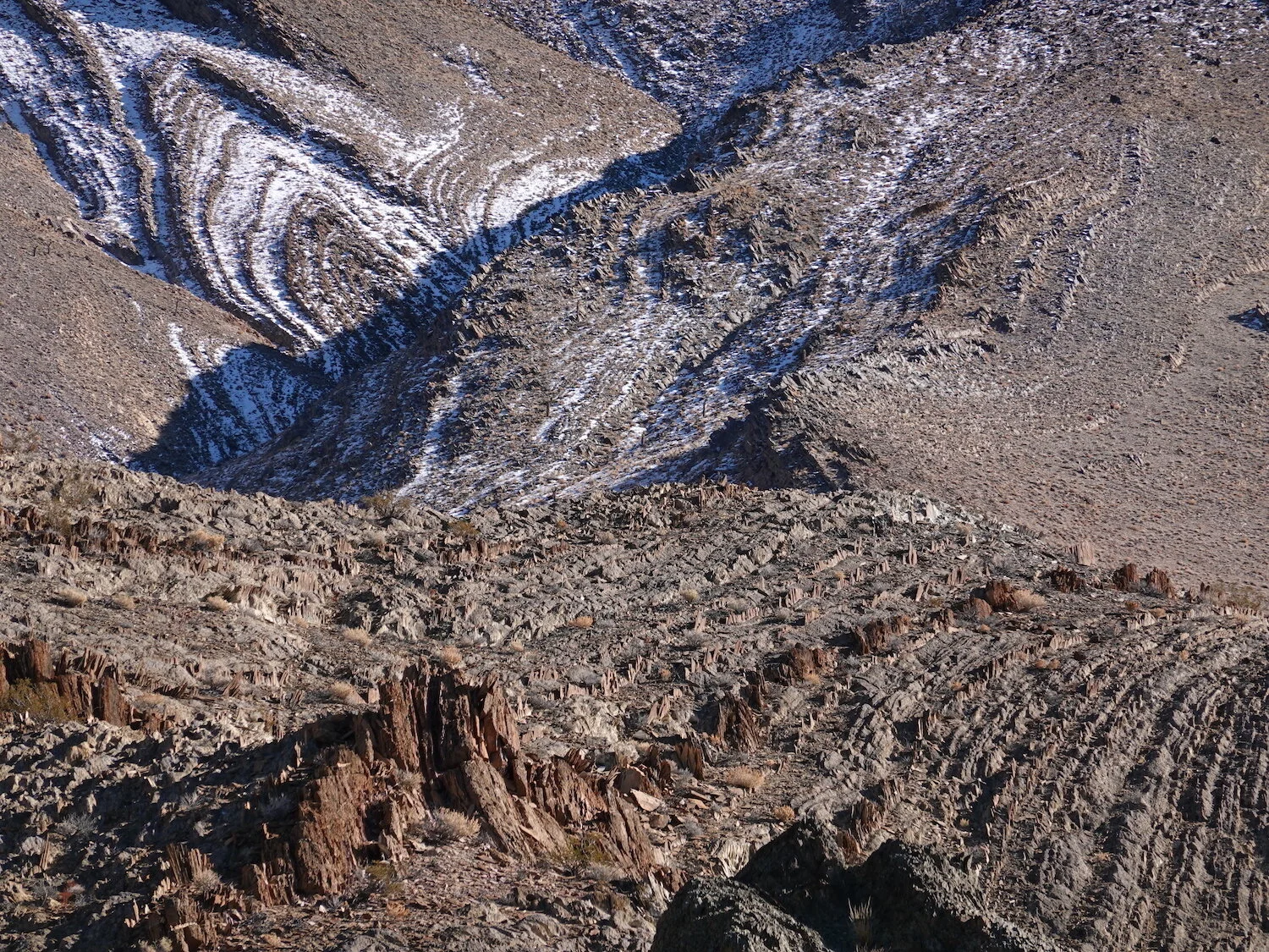 snow level creates / highlights devils dominoes / Inyo eye in sky