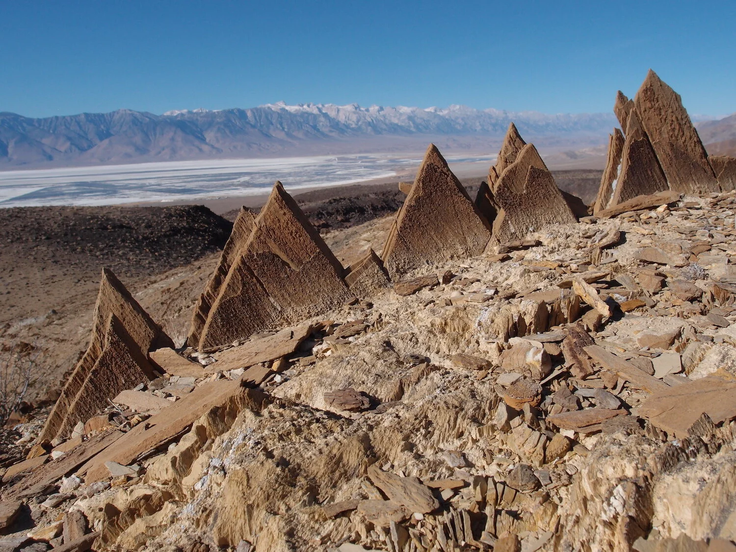 Inyo Mountains ridge / Owens Dry Lake and Sierra / stone triangle five