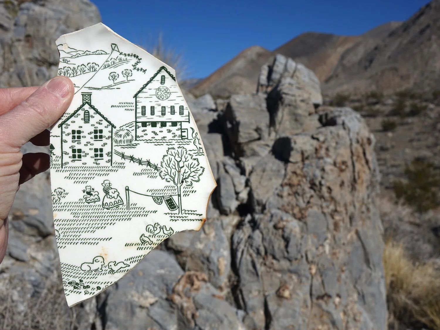 side canyon explore / a plastic bag of relics / potshard in Inyos
