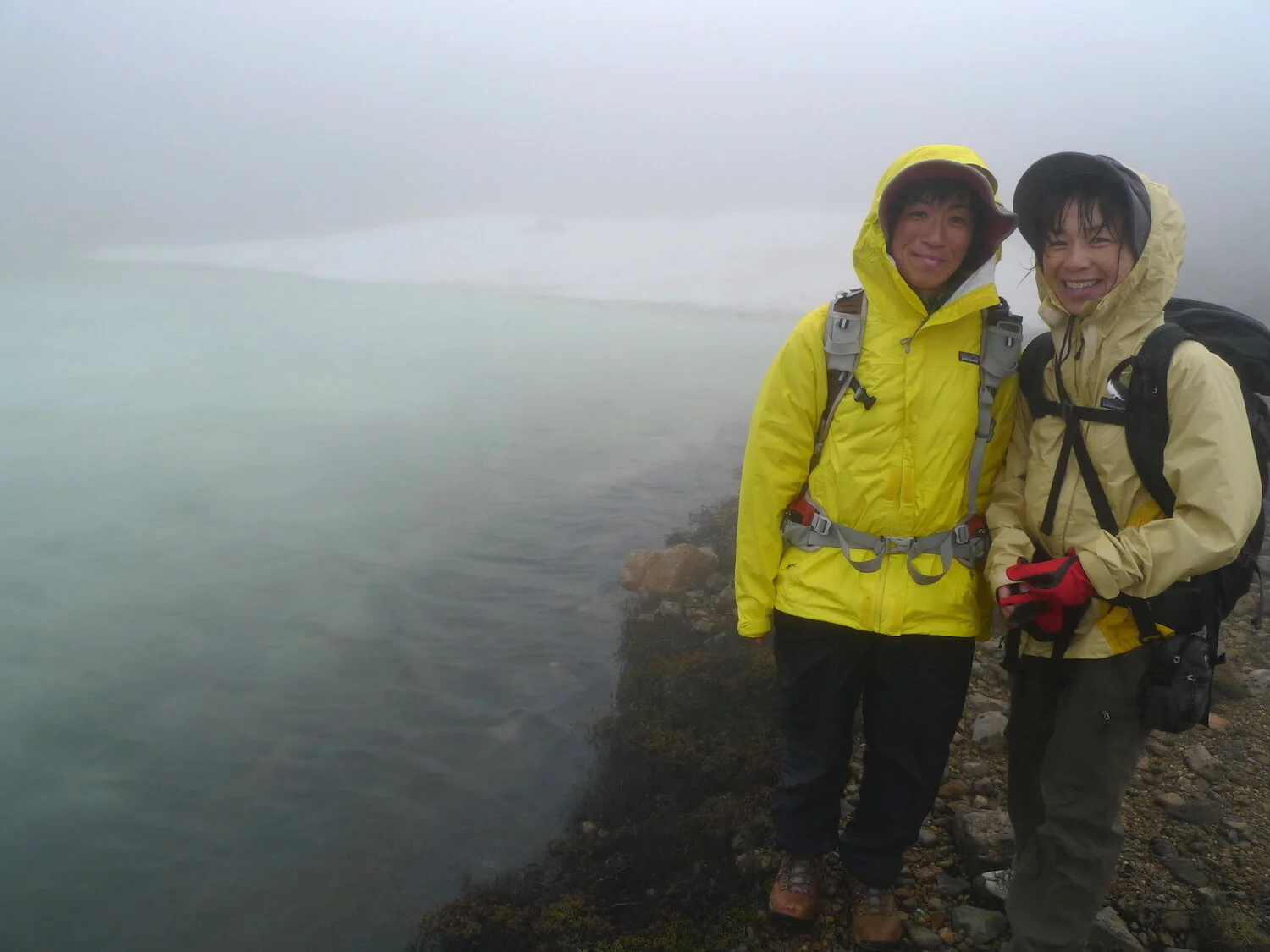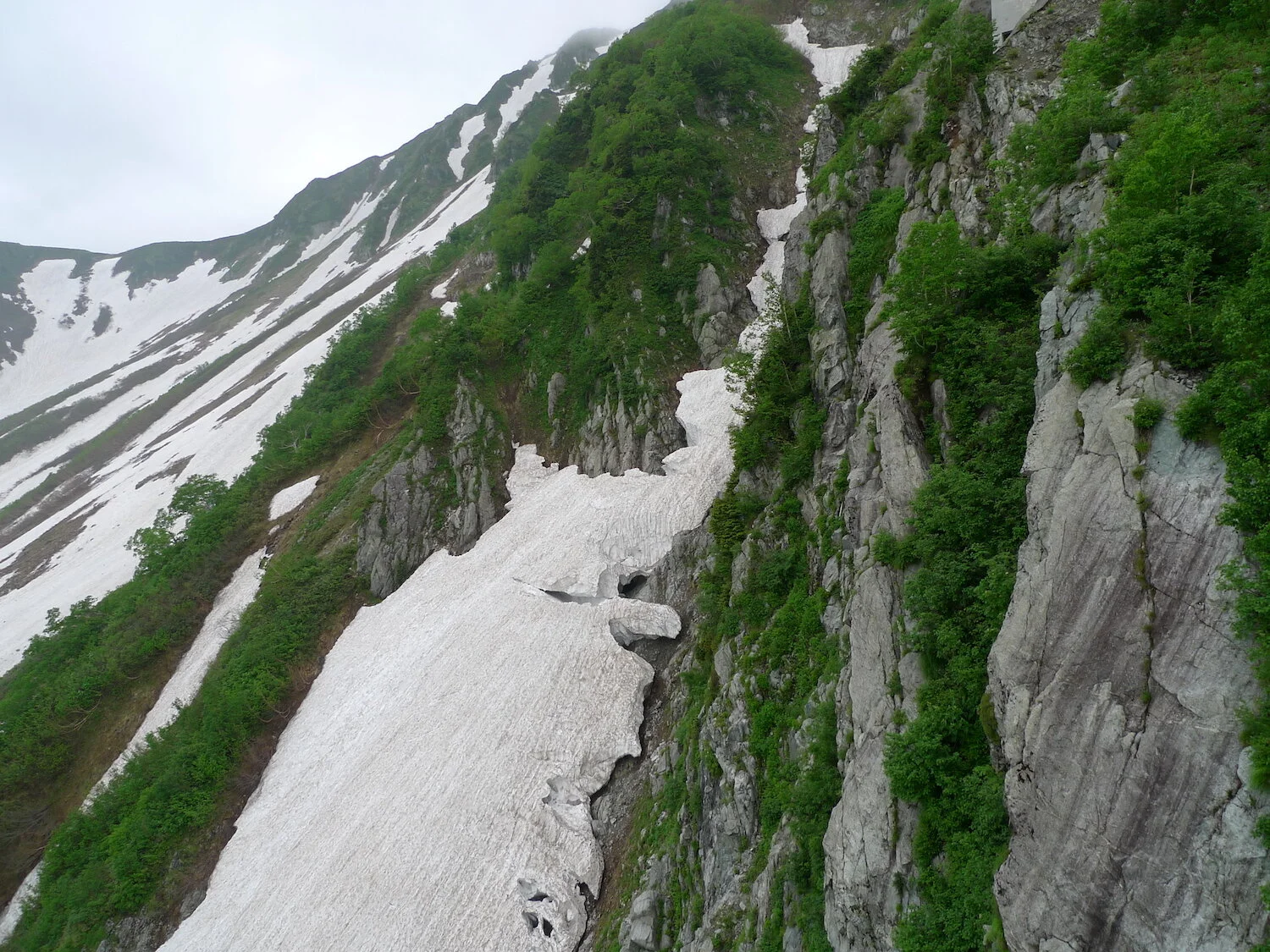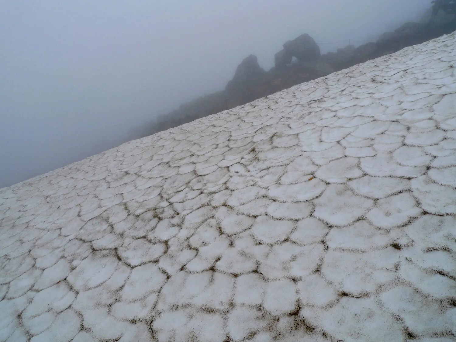 Crossing a snowbank on the way down from Ontake summit to Nino-ike