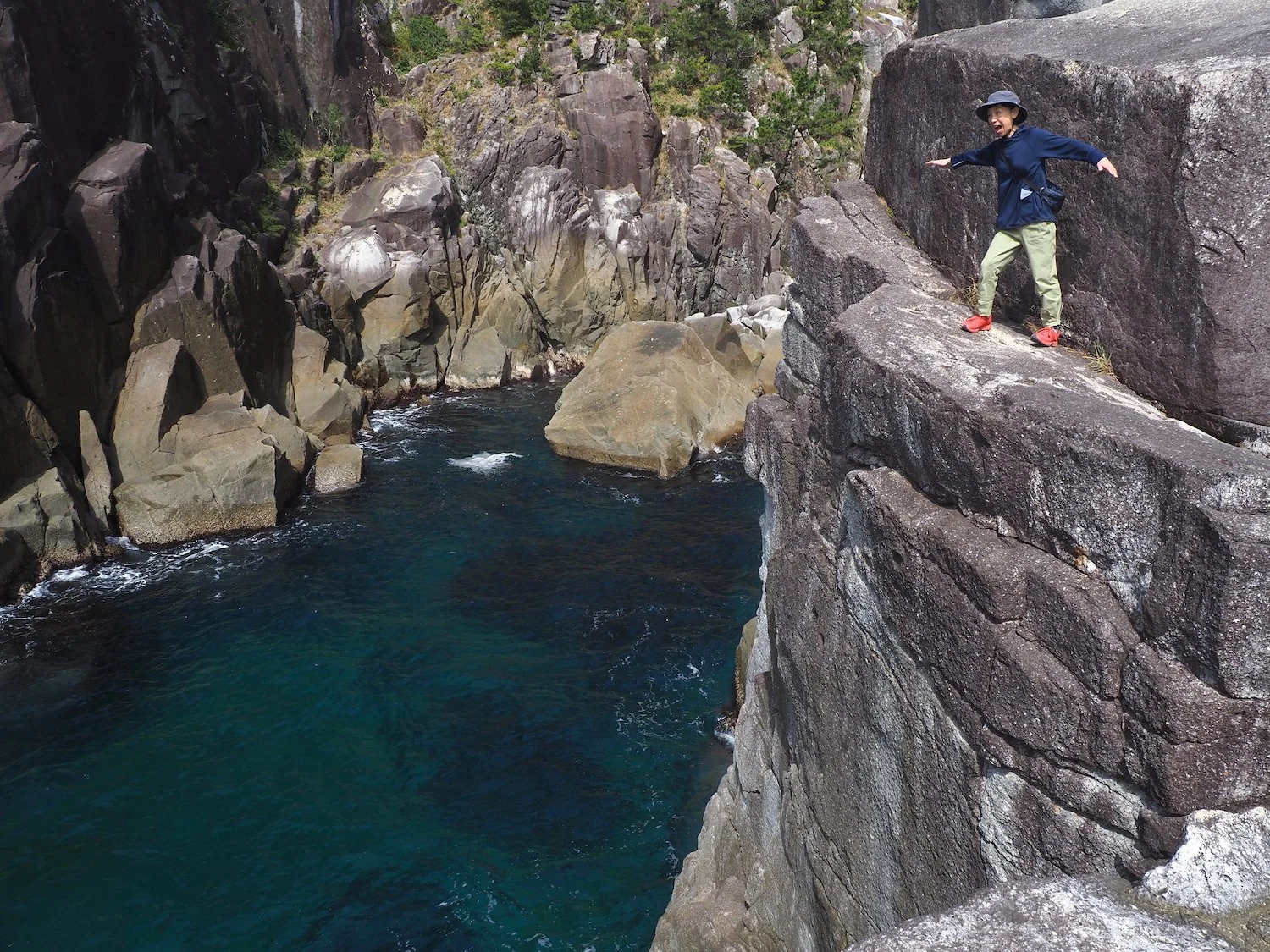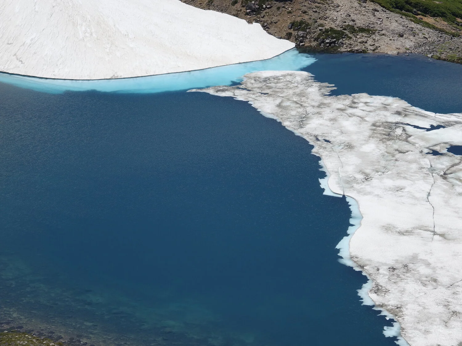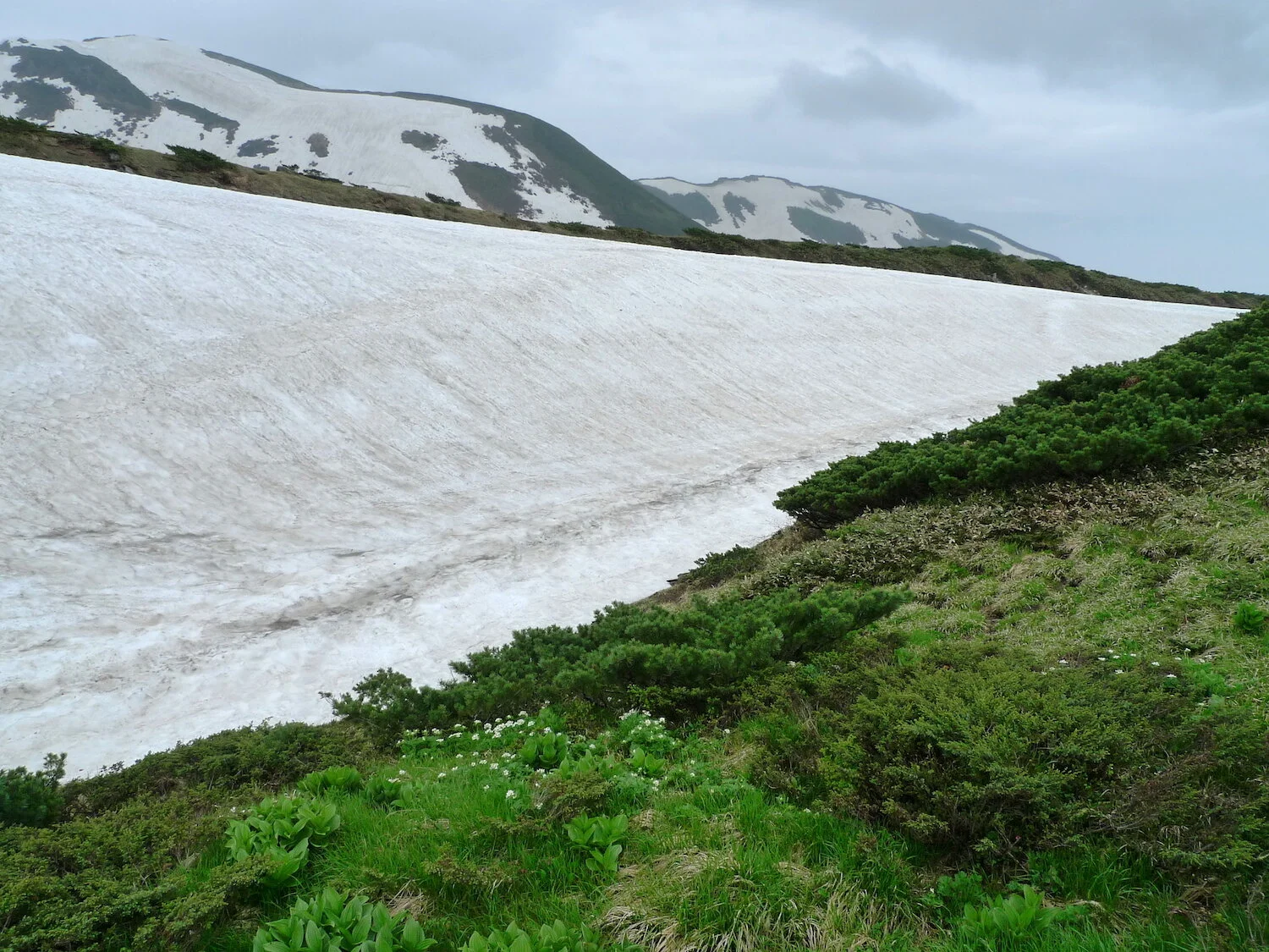 Crossing a snowbank on the way down from Ontake summit to Nino-ike