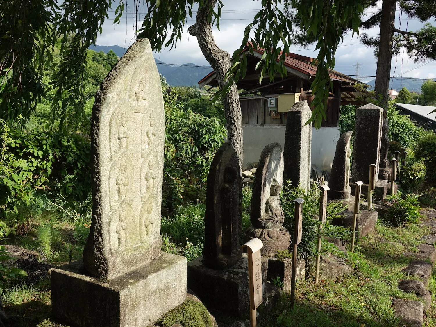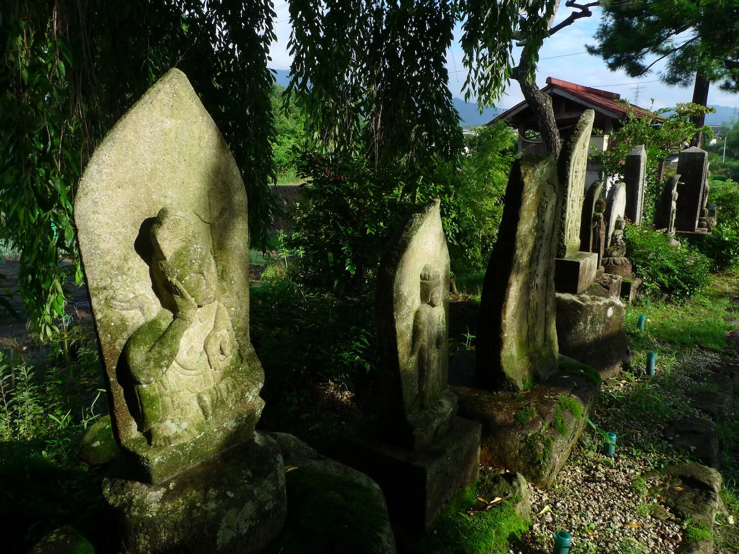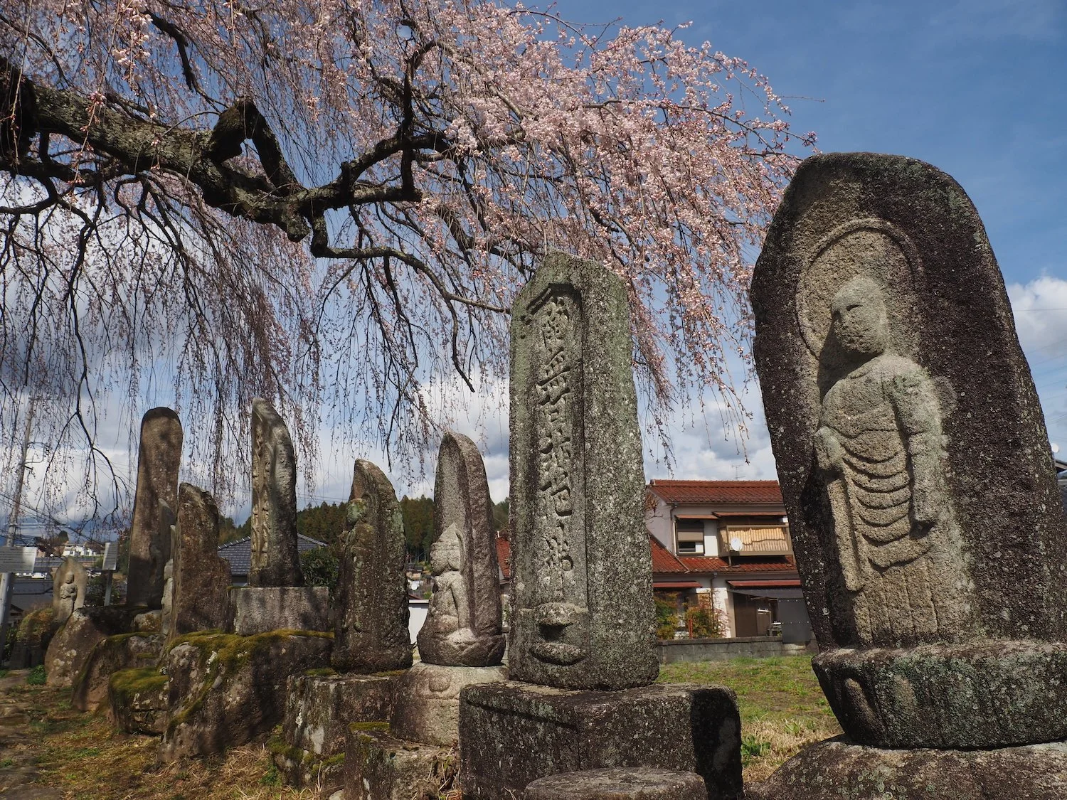 Stone statue in a neighborhood shrine below a giant cherry tree in Nakatsugawa
