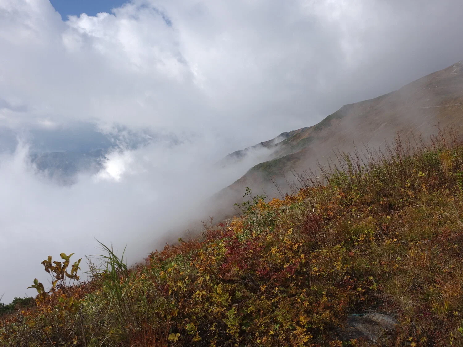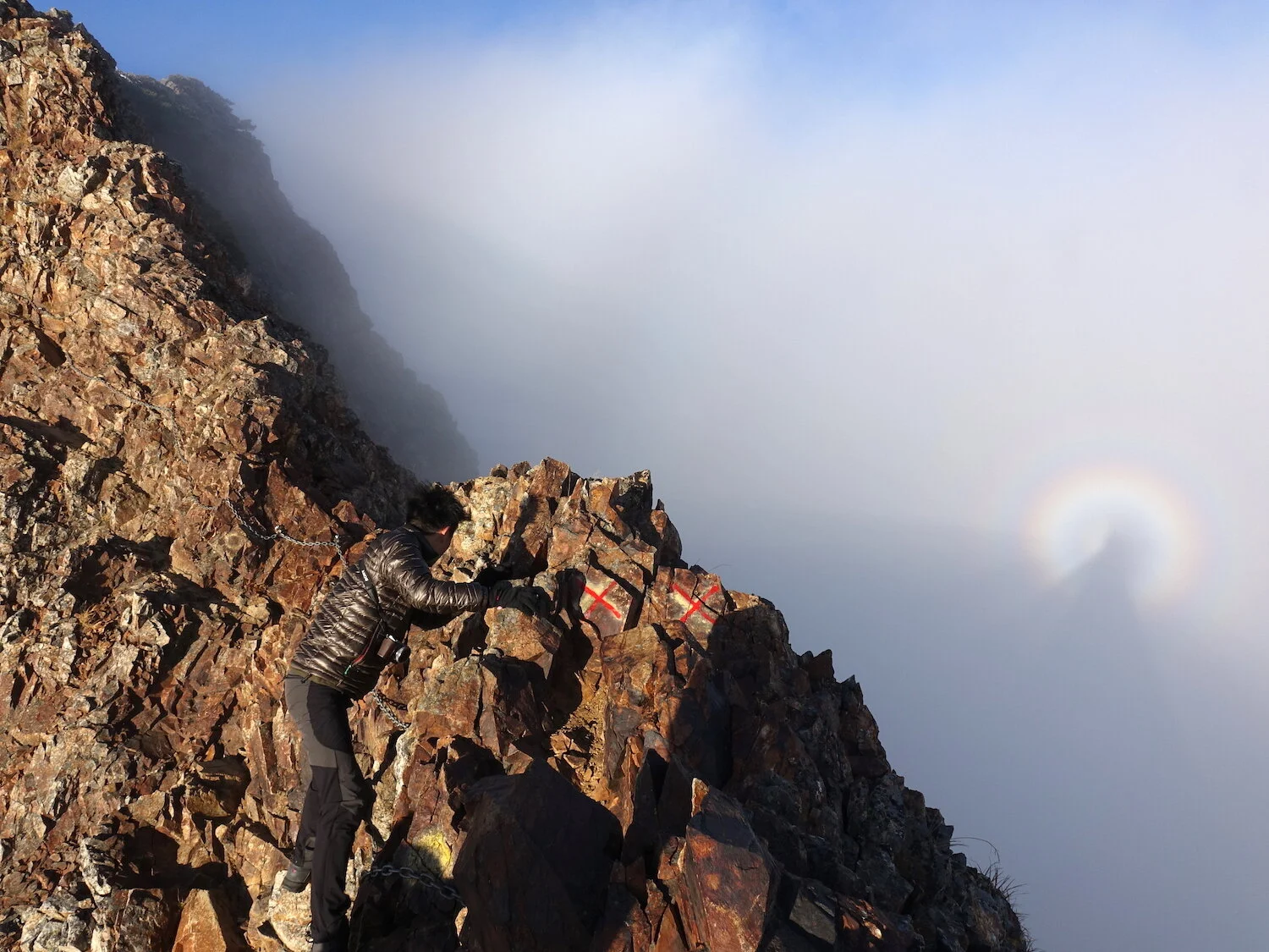 A Brocken spectre light phenomenon on a steep section of ridge with chains south of Karamatsu-dake.