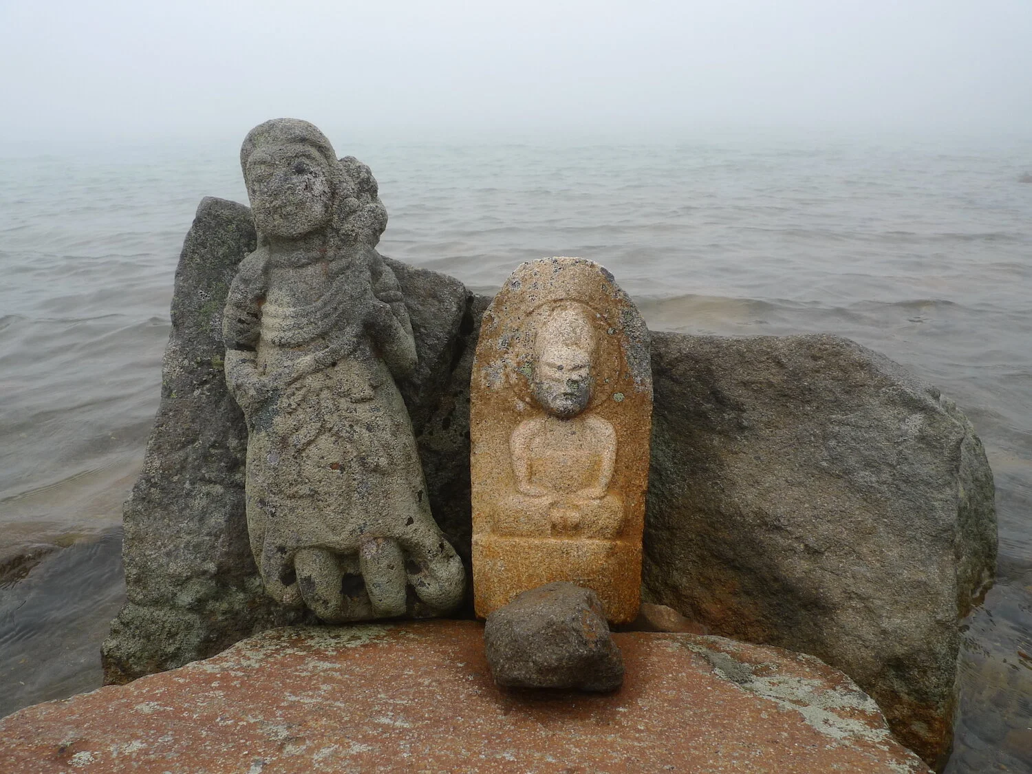 Stone statues on the edge of Nino-ike (pond) in the crater of Ontake in 2012. A phreatic eruption in 2014 changed the dimensions of this lake, the highest elevation lake in Japan.