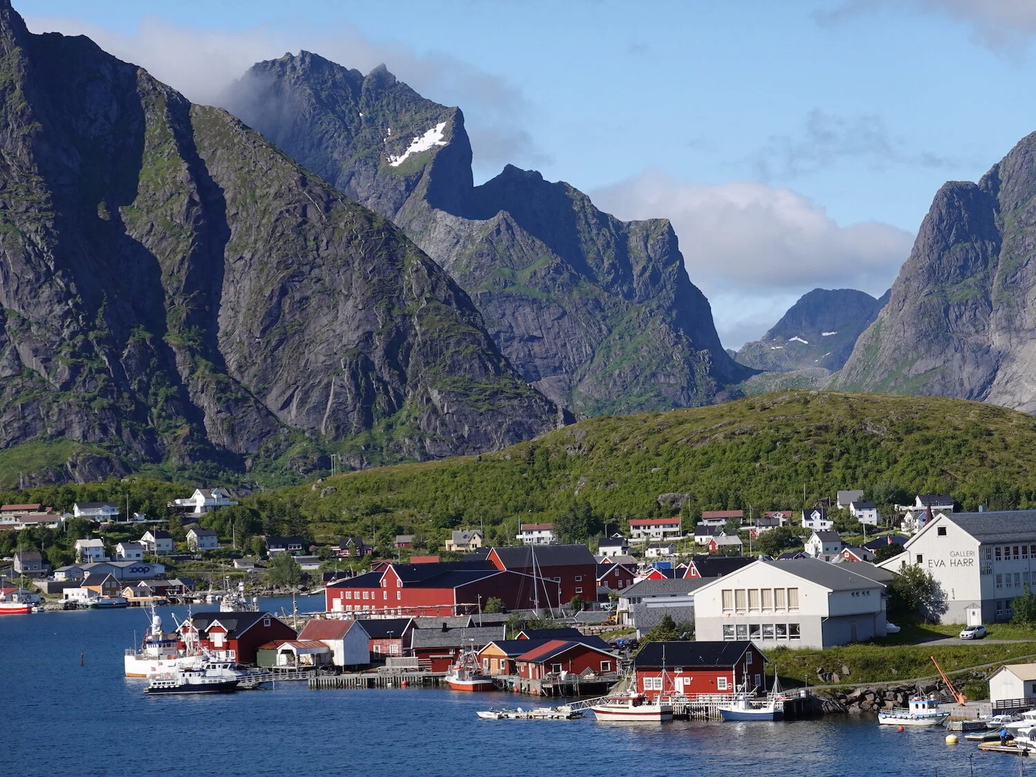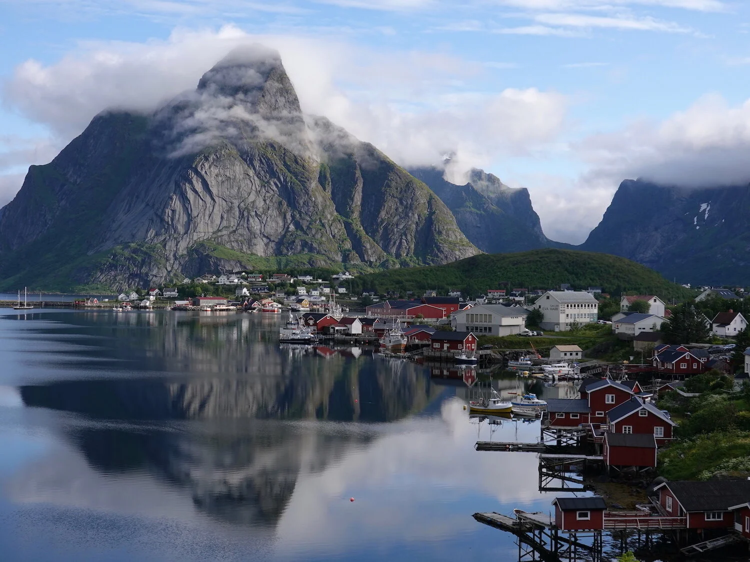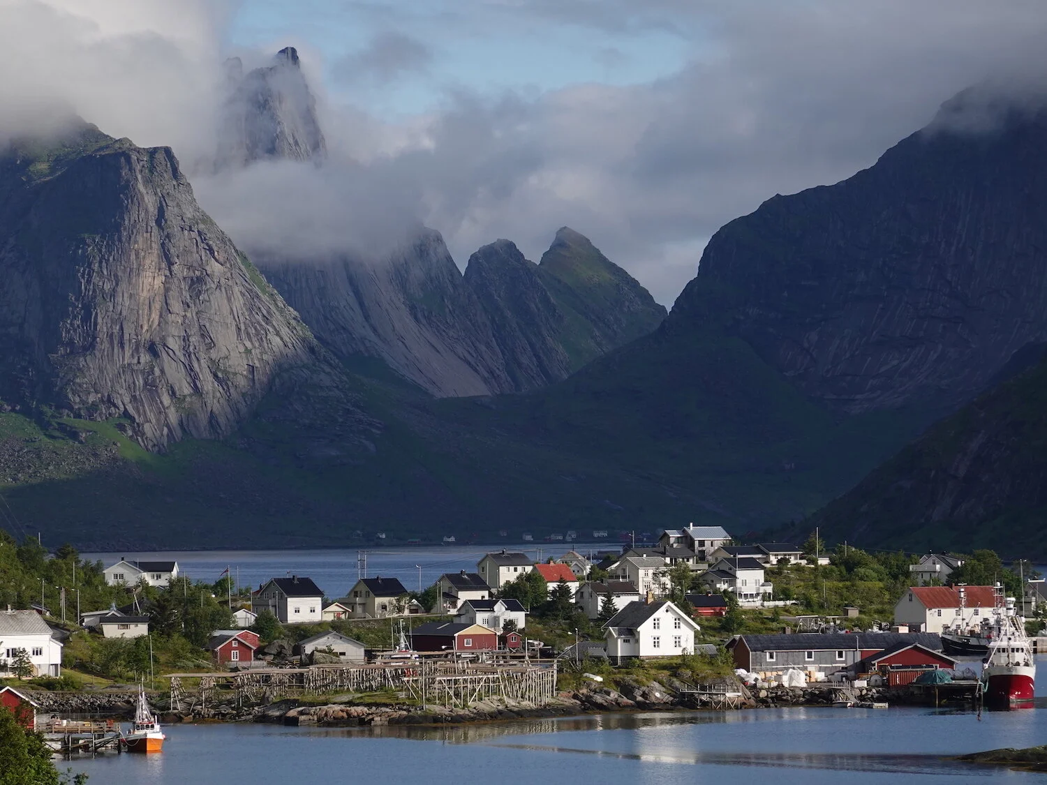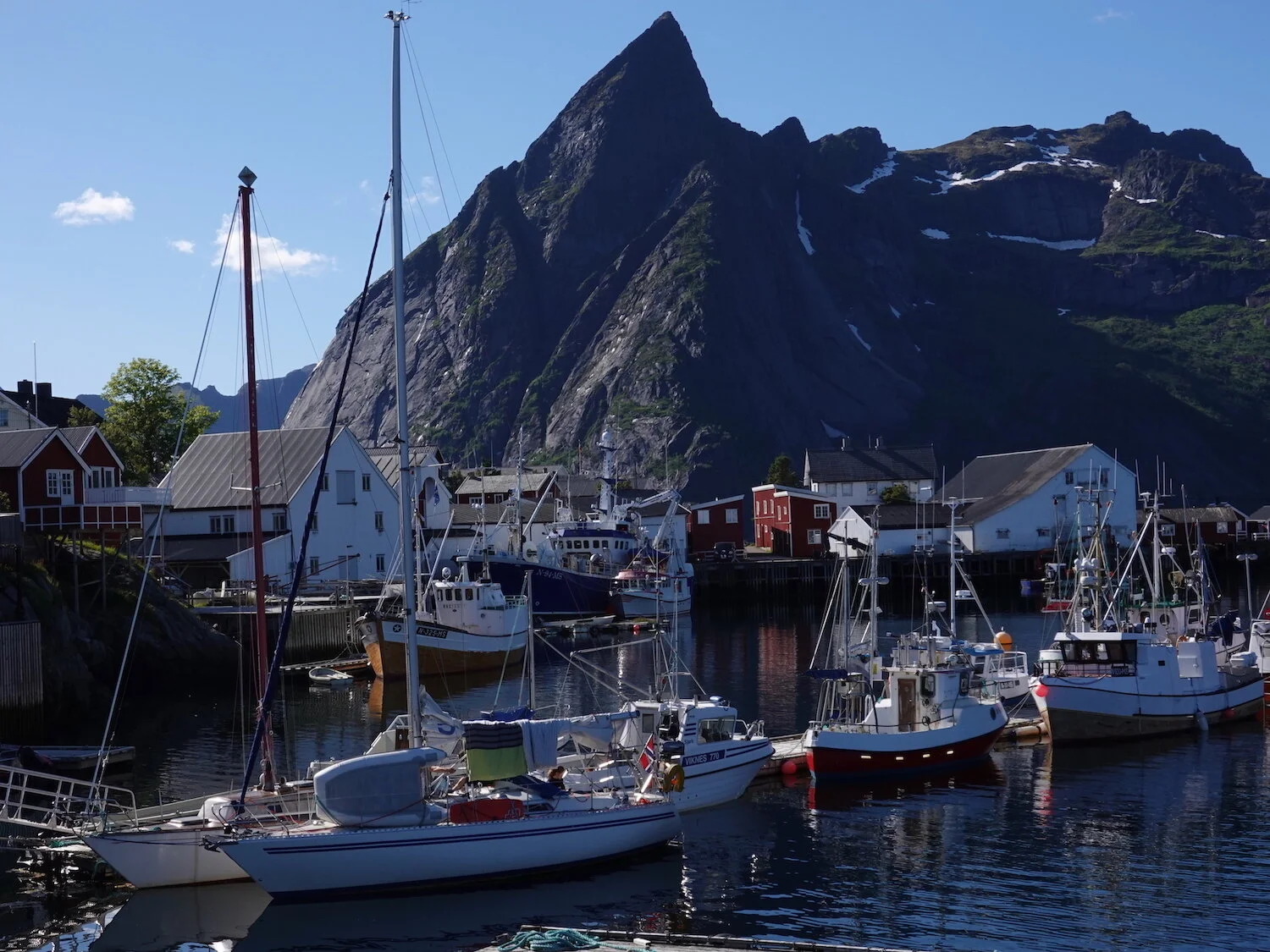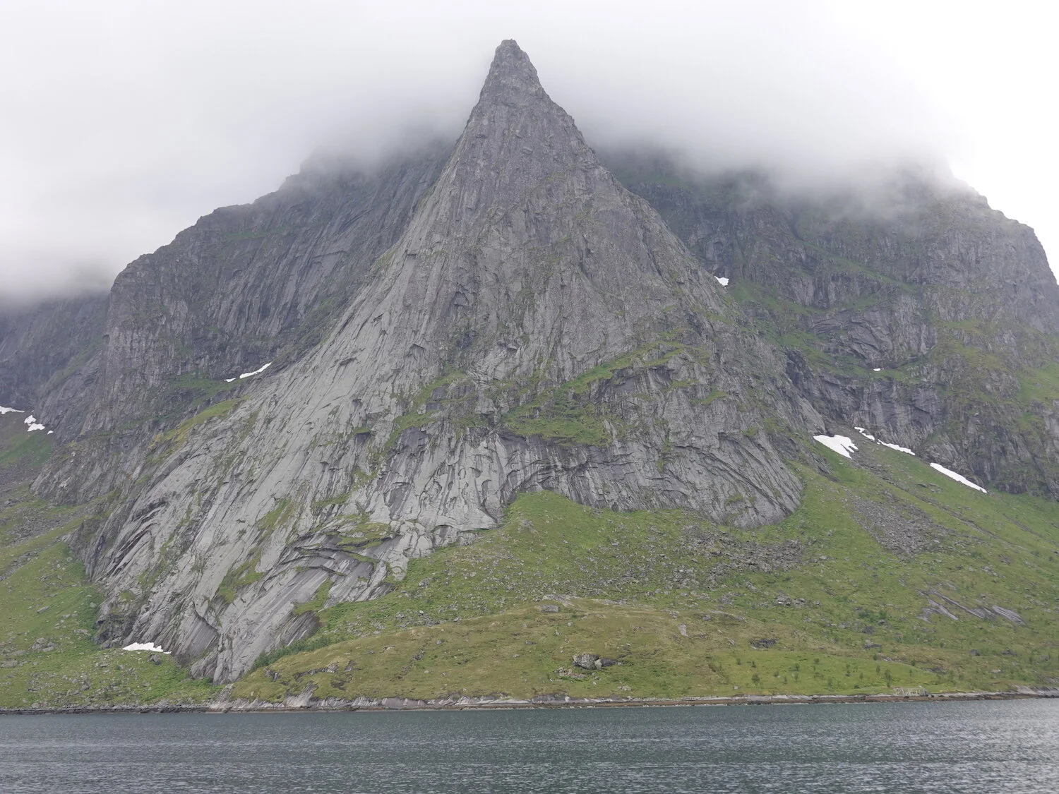 The comically steep peak of Olstinden viewed from one of the small fishing villages in Reinefjord