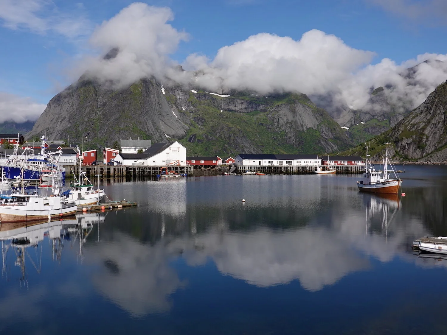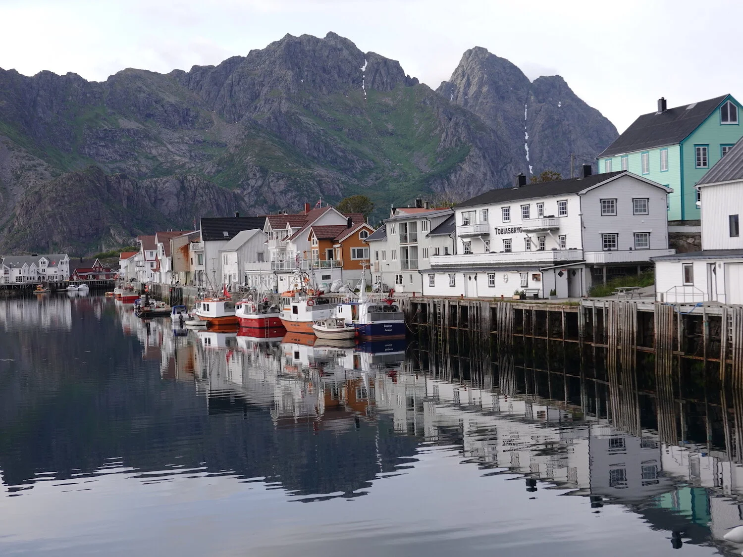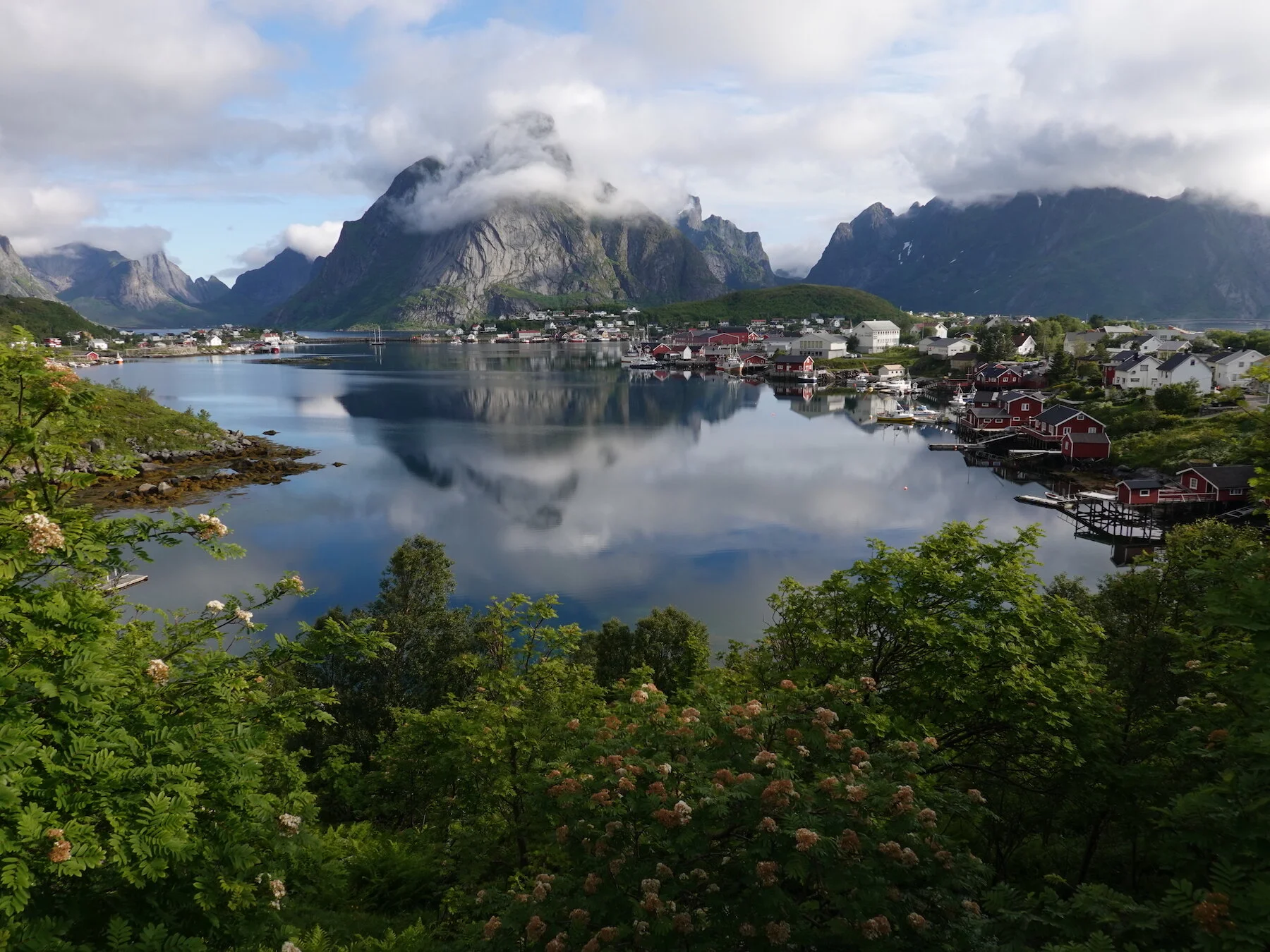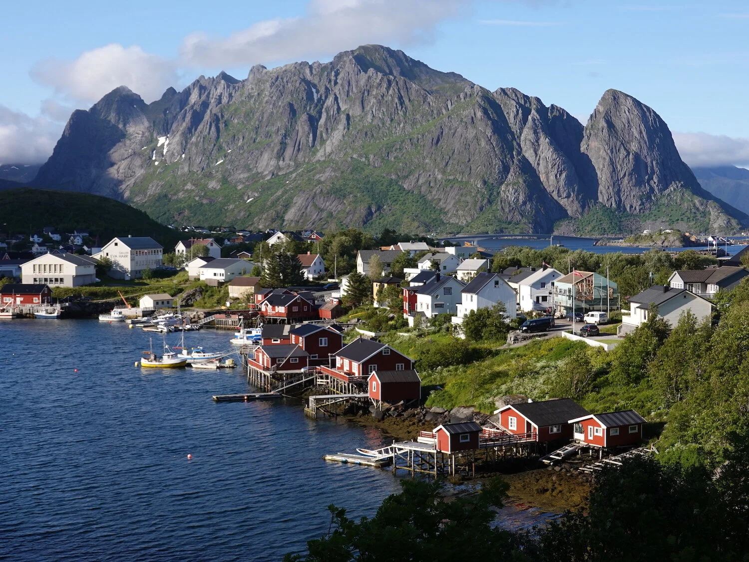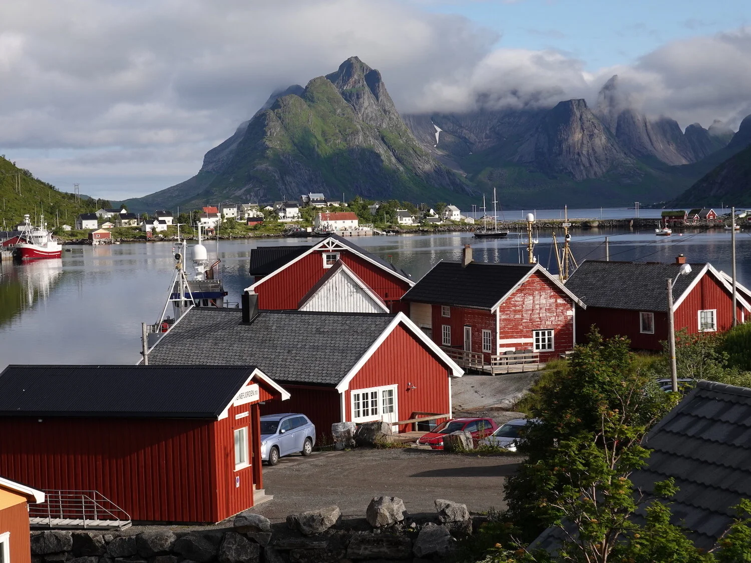The comically steep peak of Olstinden viewed from one of the small fishing villages in Reinefjord