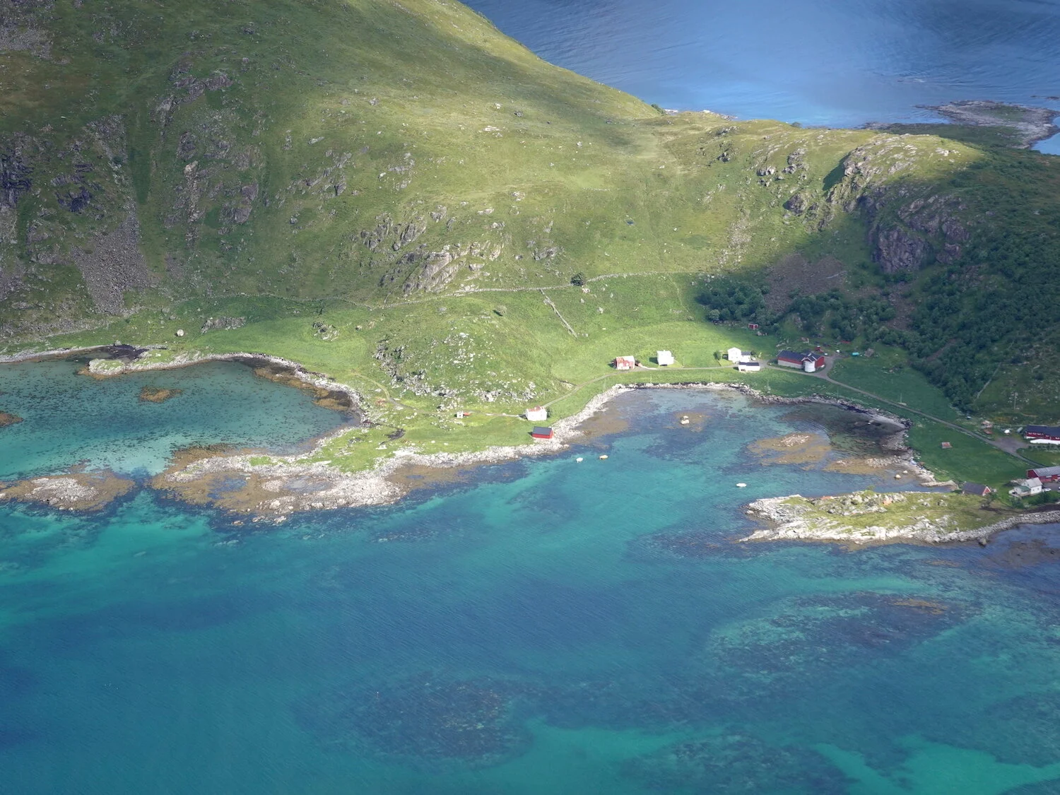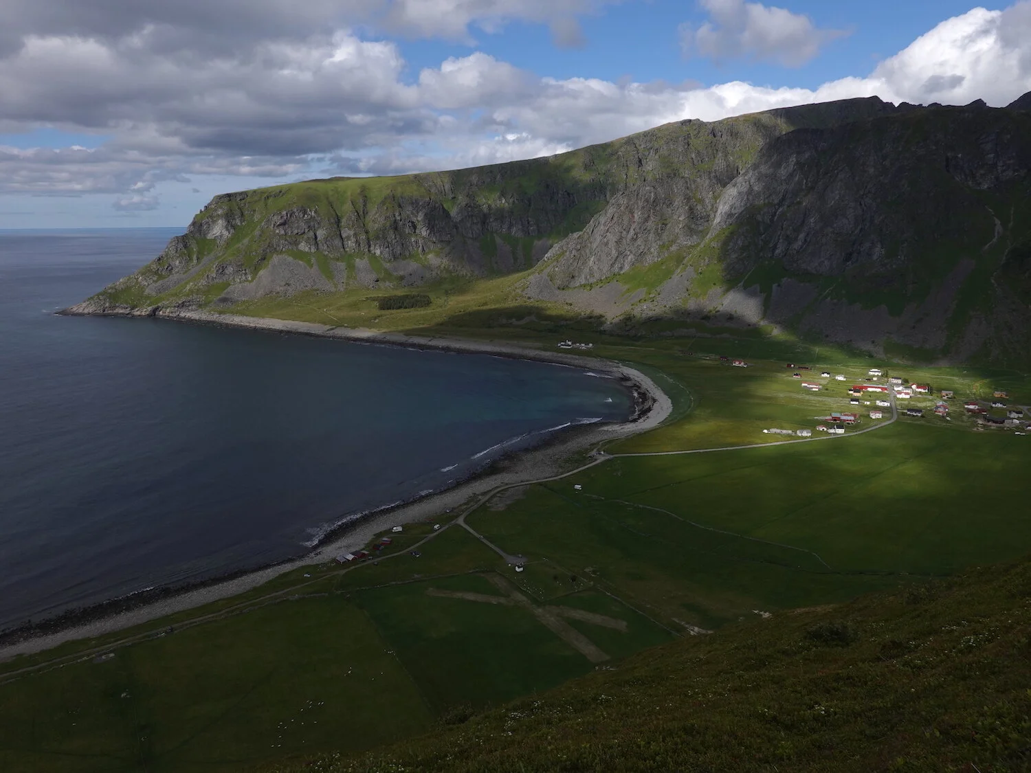 The small community of Unstad and the beach popular with surfers from the top of Nonstind