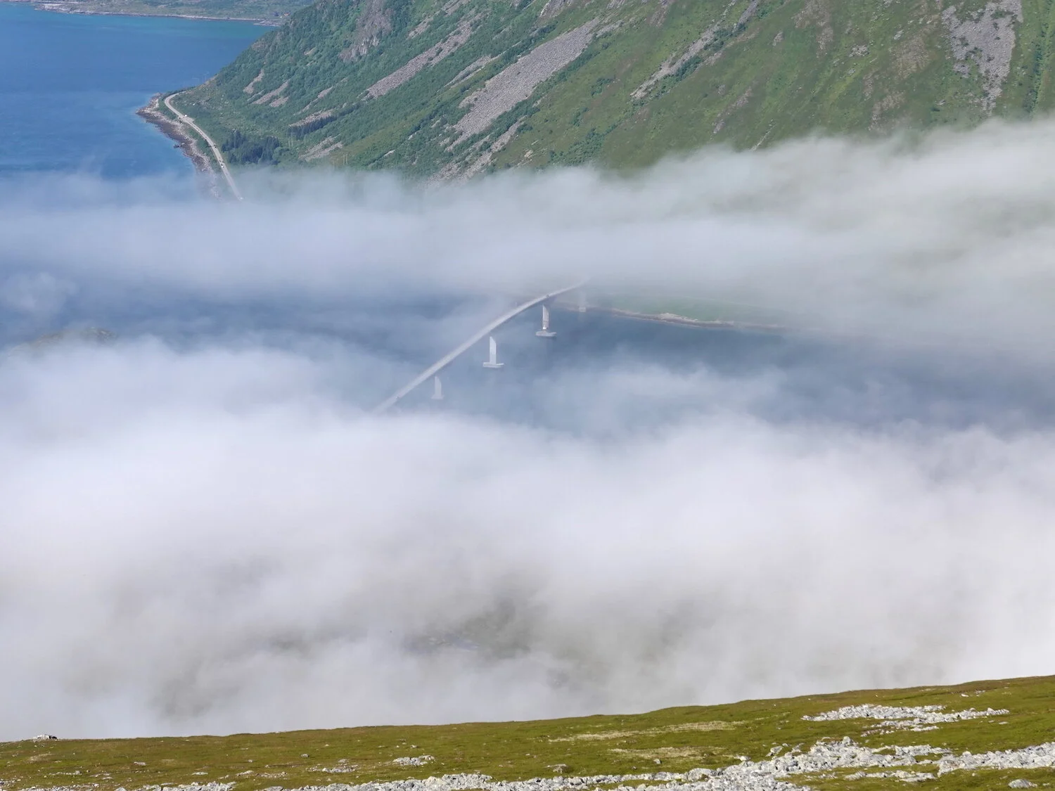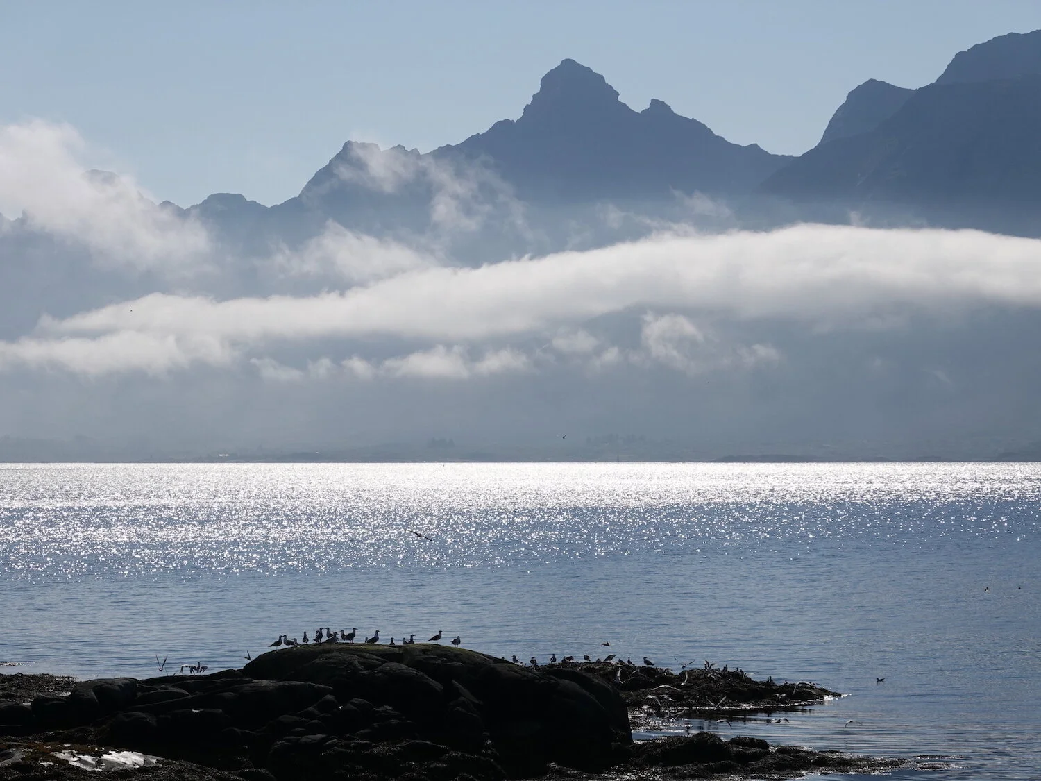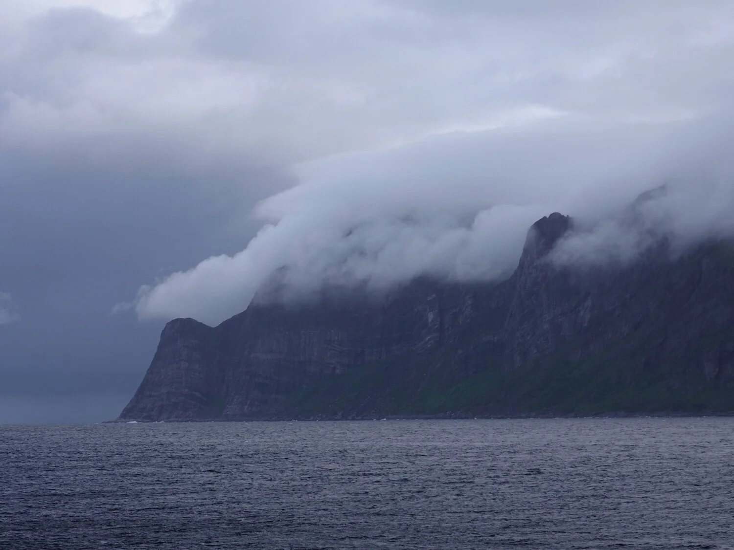 Clearing fog reveals / Segla (the sail) and two fjords / a break in the rain