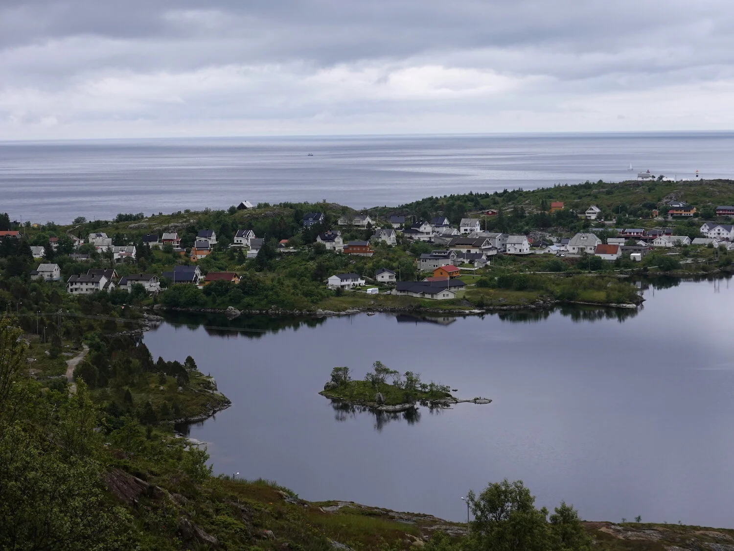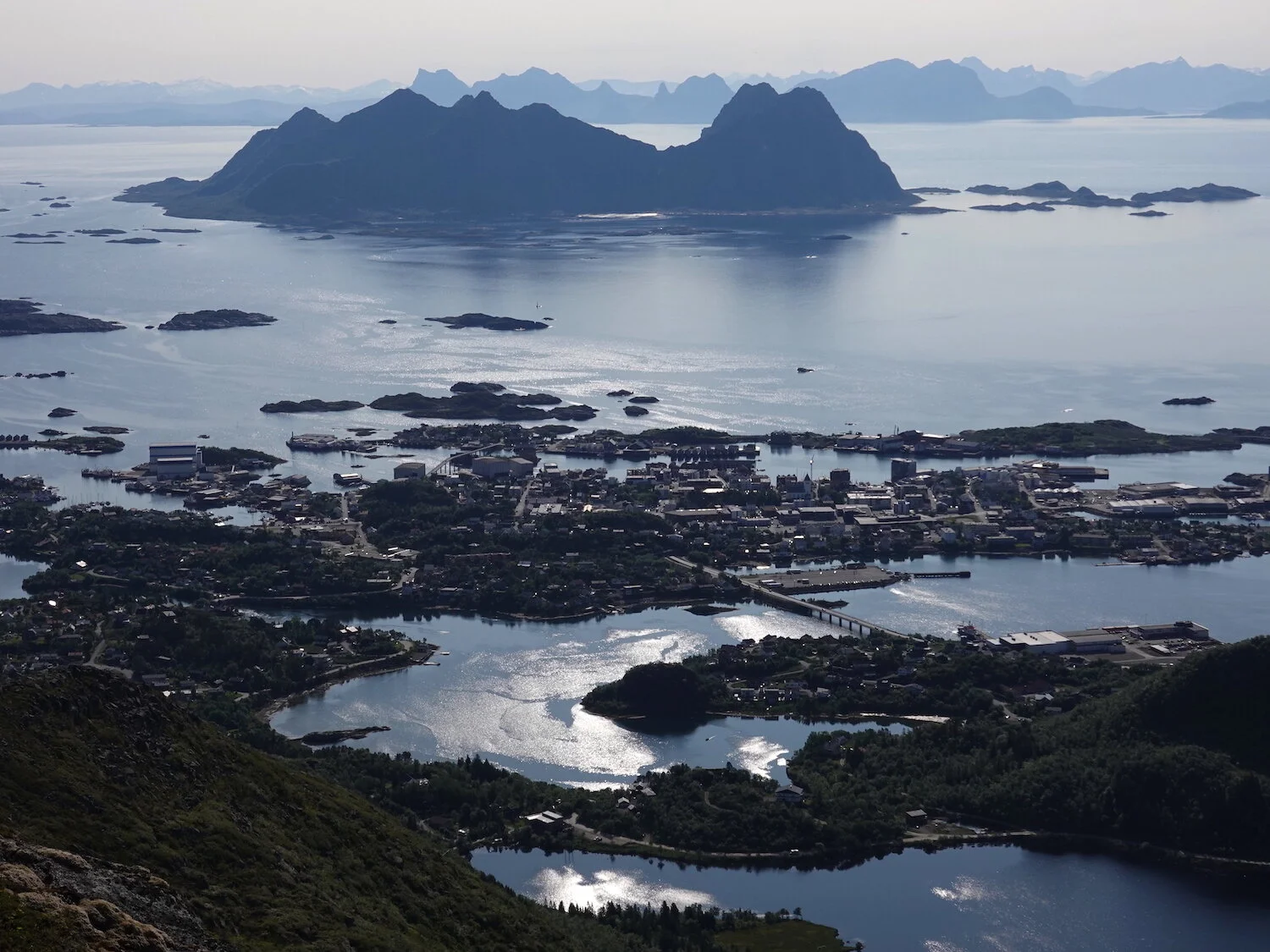 View across Svolvaer past Stormolla Island to the mainland from Kongstindan. Svolvaer was the biggest town we went to in Norway.
