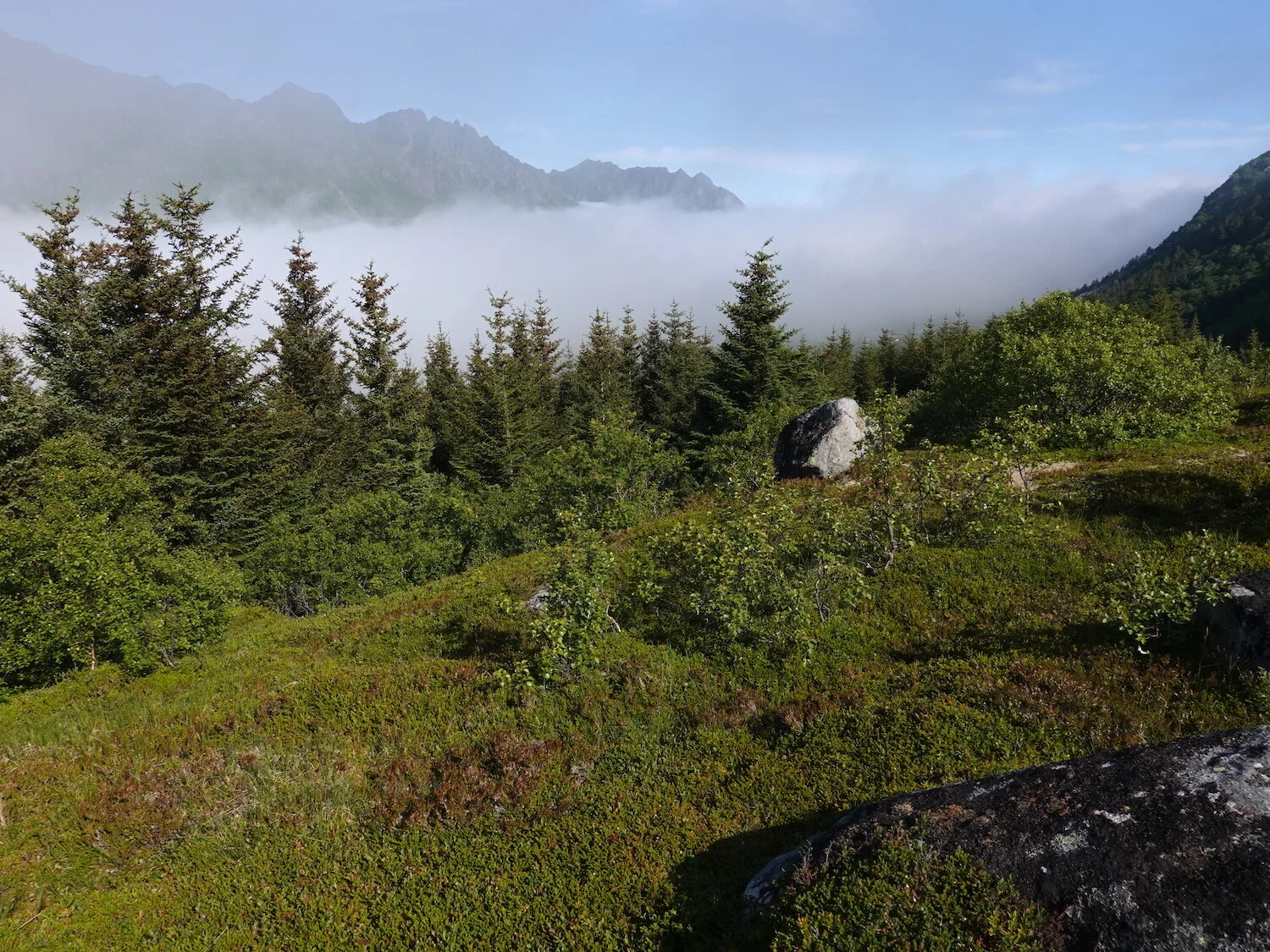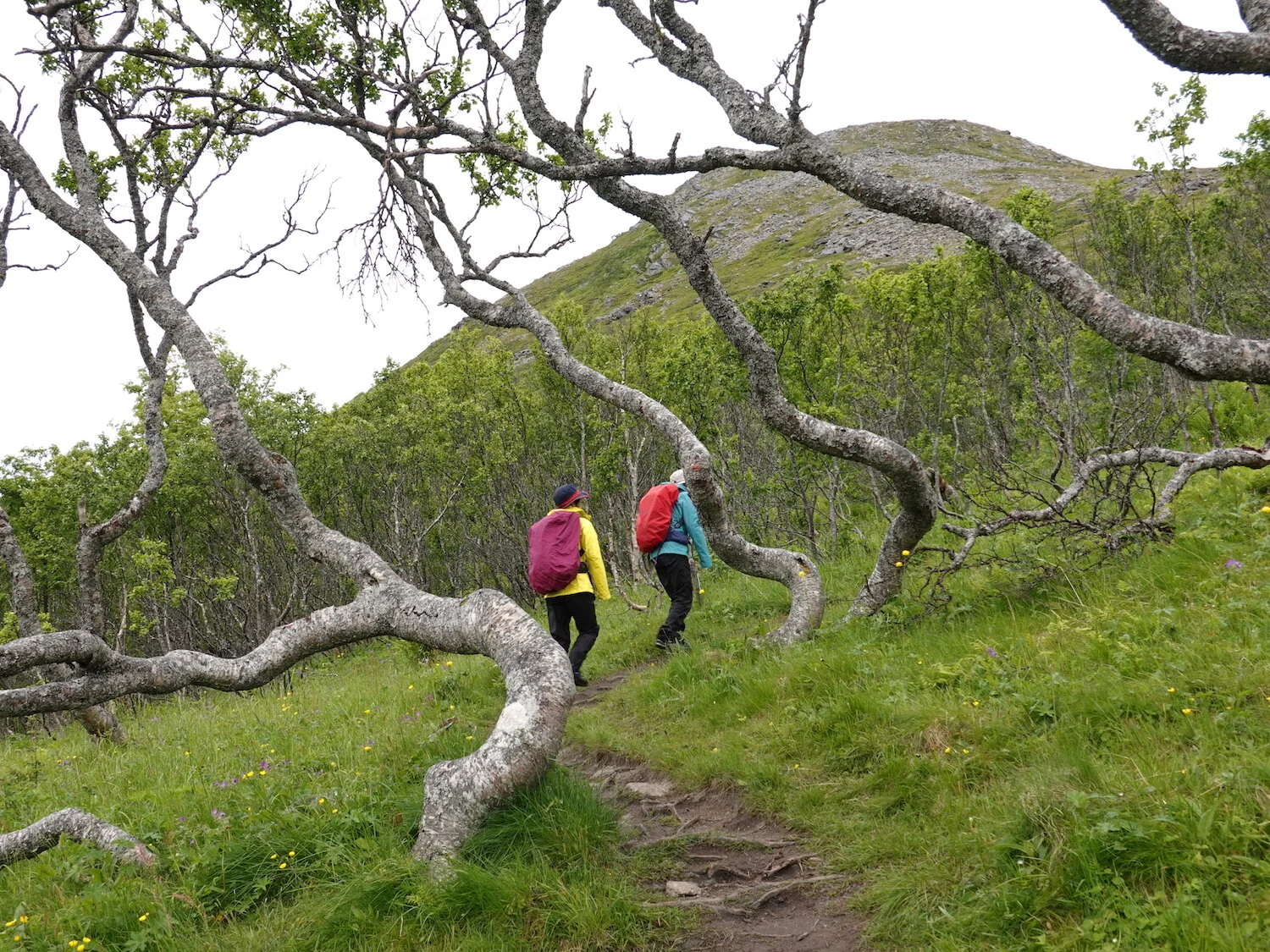 Hiking up though a forest of scrubby birch-like trees on Andoya