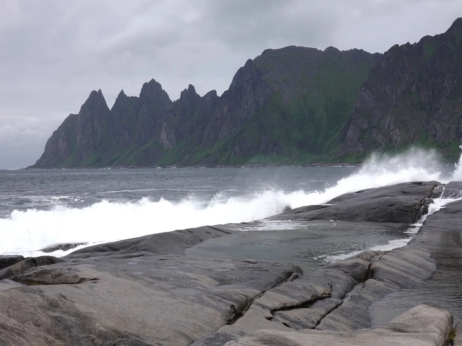 The first full day we drove to the island of Senja and whenever we'd get close to a hike the weather would move in. Looking up toward Breidtinden from near Mefjordotn