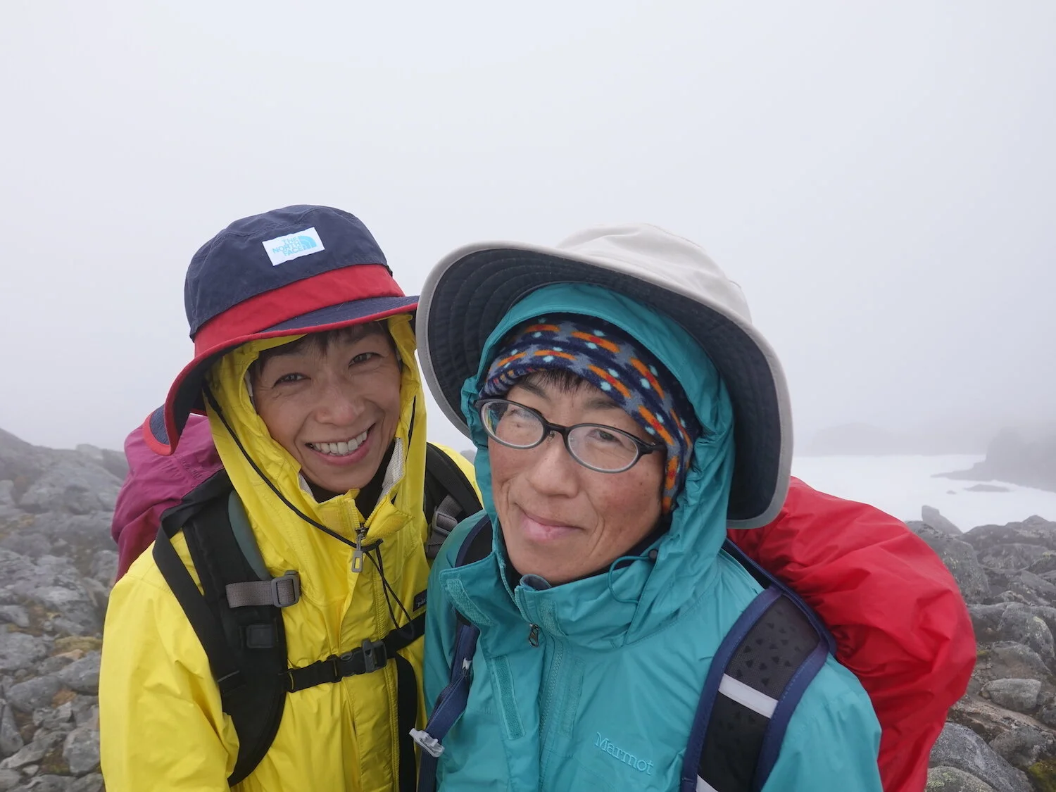 Junko and Hiroko hiking up a cable on a slippery and wet slope on the hike up to Munken