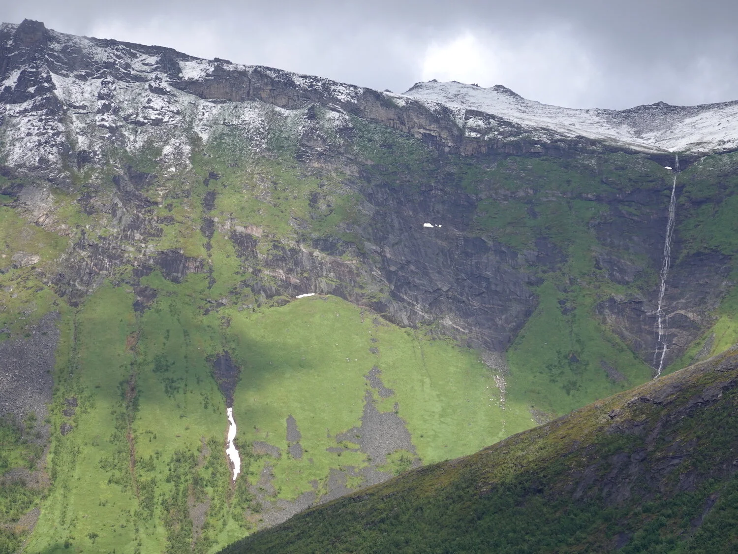 We drove back over to Fjordgard through a narrow dark and steep tunnel and couldn't help but to notice some white material on the peaks
