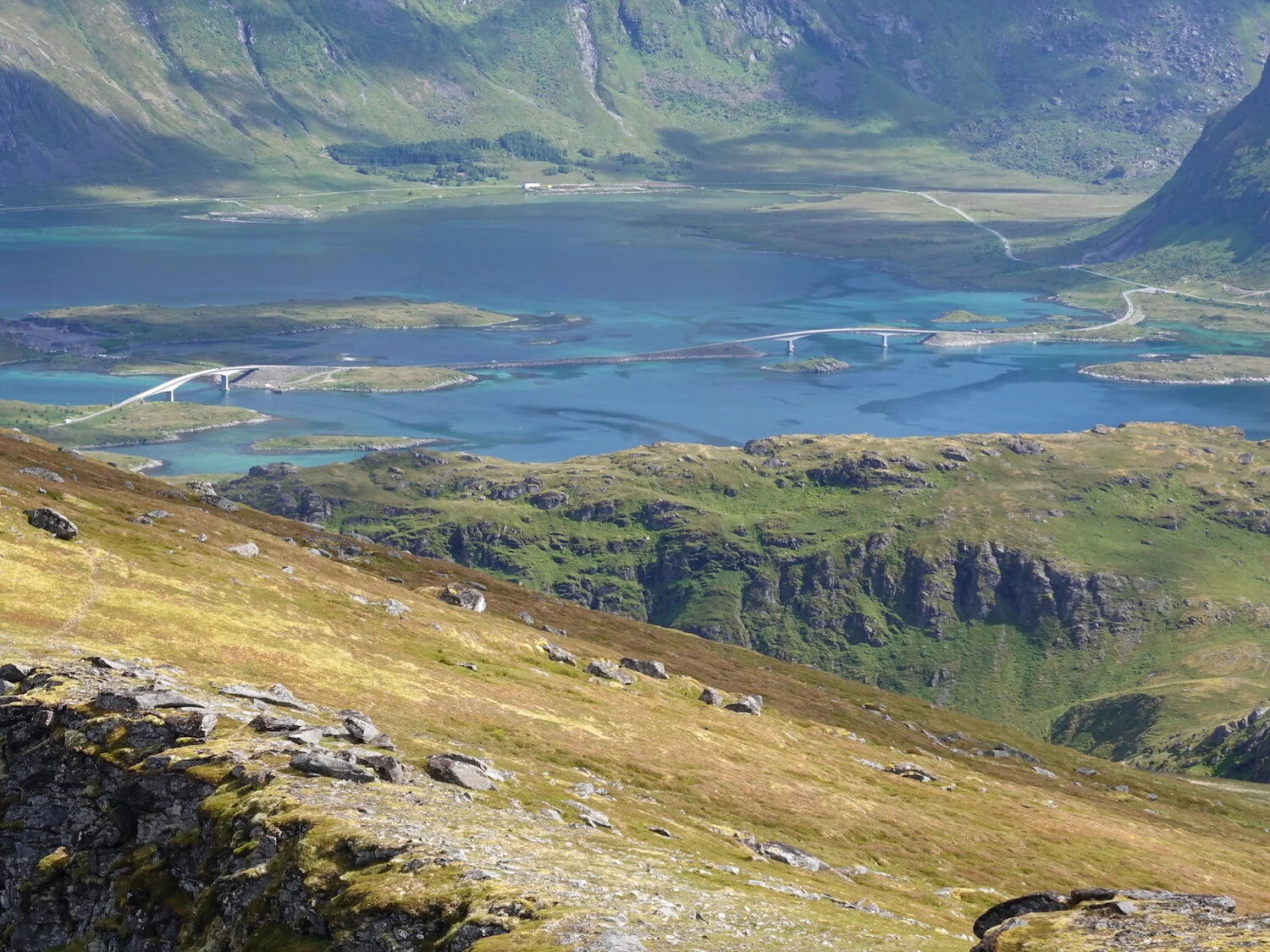 The bridge from Flakstad over to Fredvang. Norway has invested heavily in their infrastructure so that there are bridges or undersea tunnels to really small towns such as Fredvang. This is a much smaller town compared to what the famed "Bridge to Nowhere" out of Ketchikan would travel to.