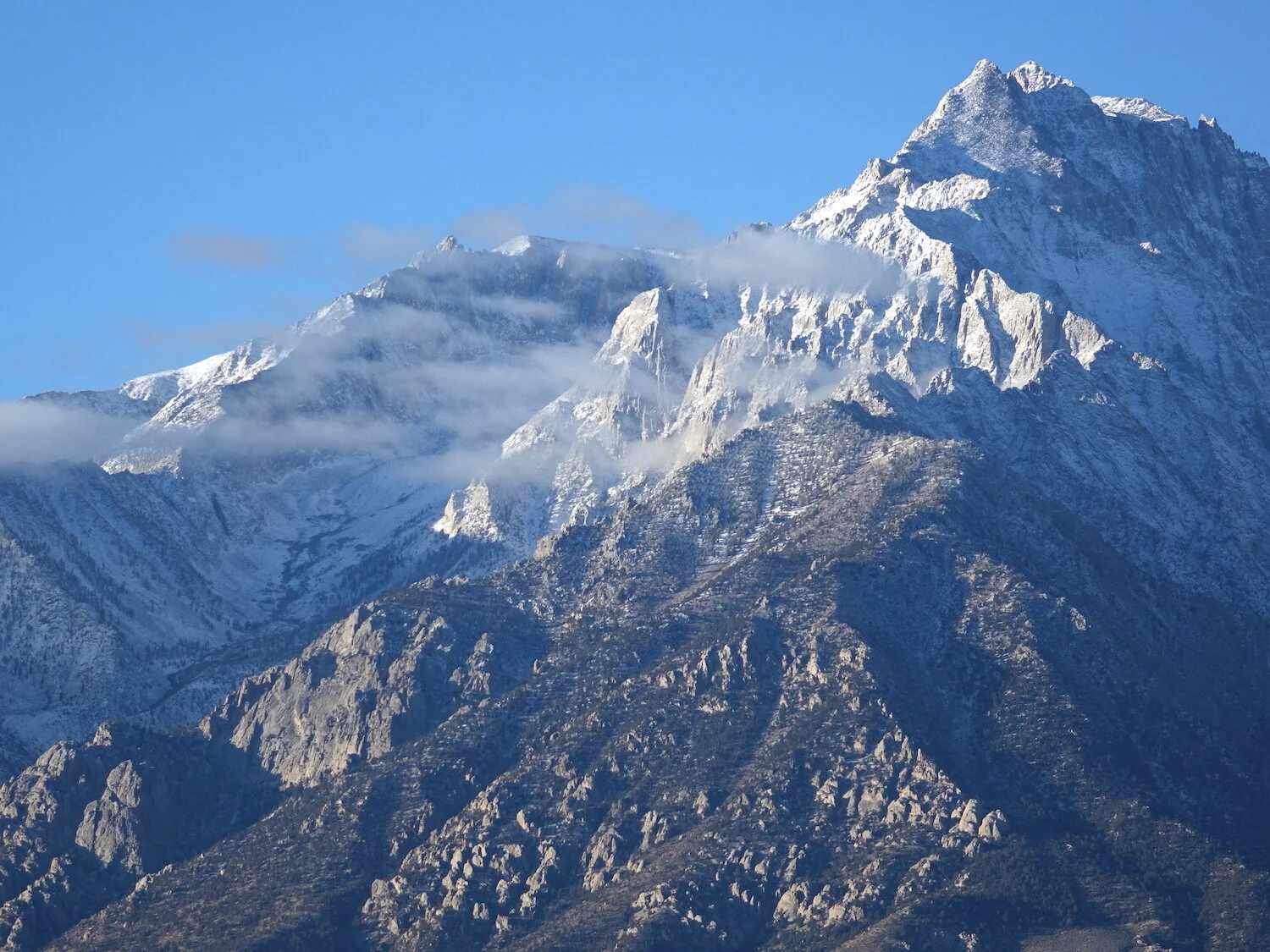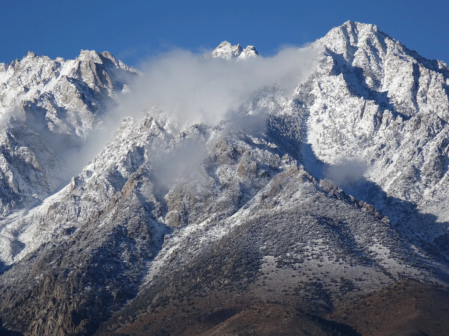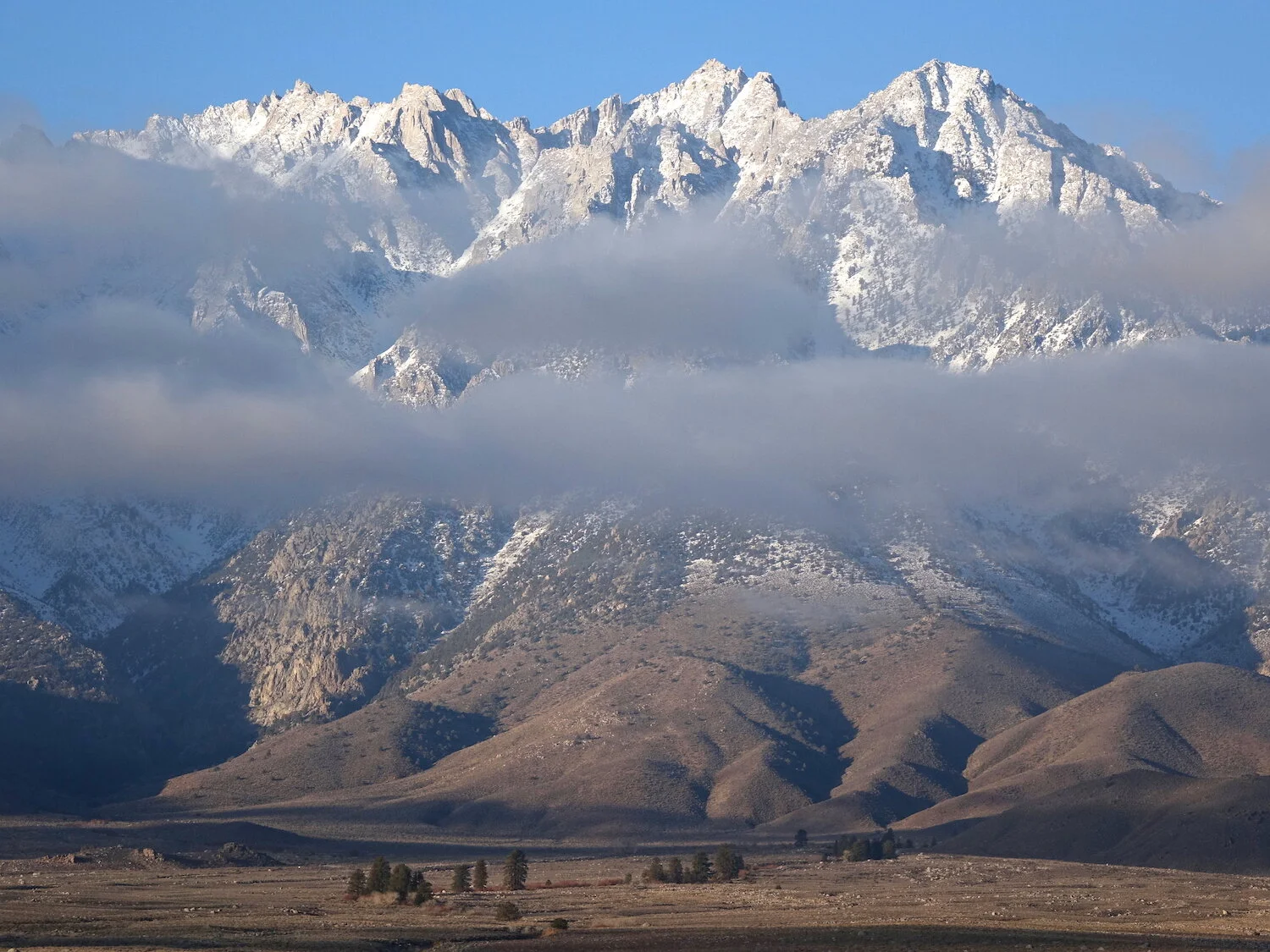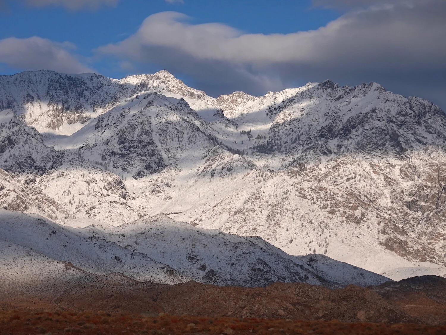 Fresh snow on the Sierra escarpment viewed from just west of the Eastern California Museum