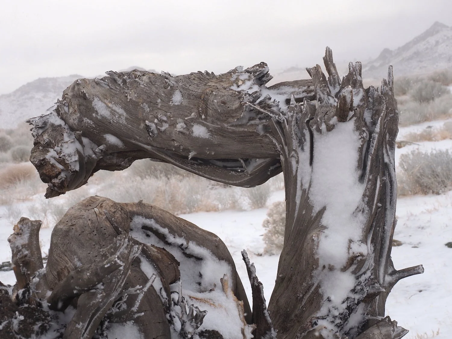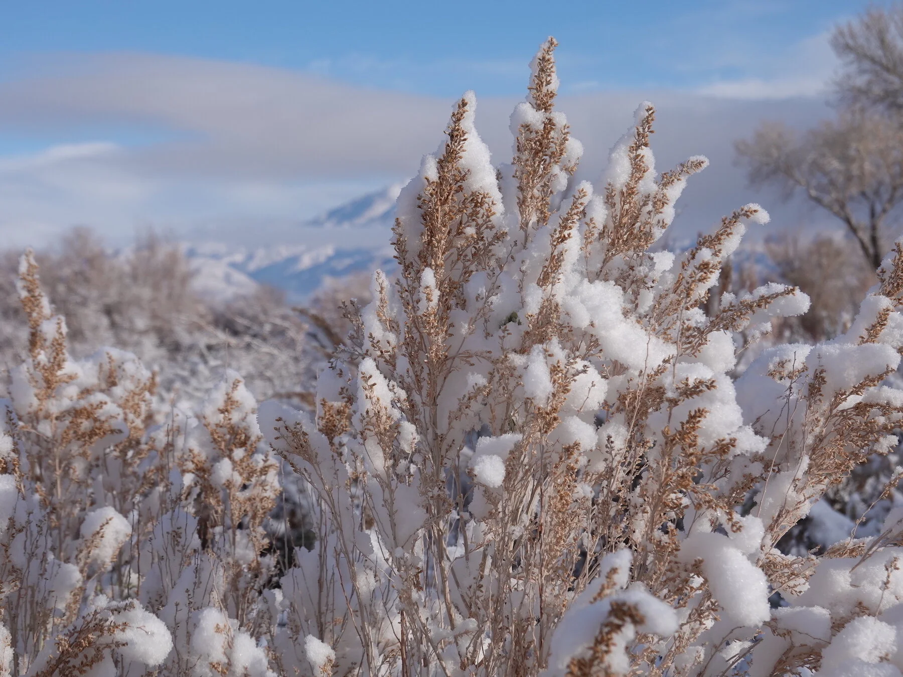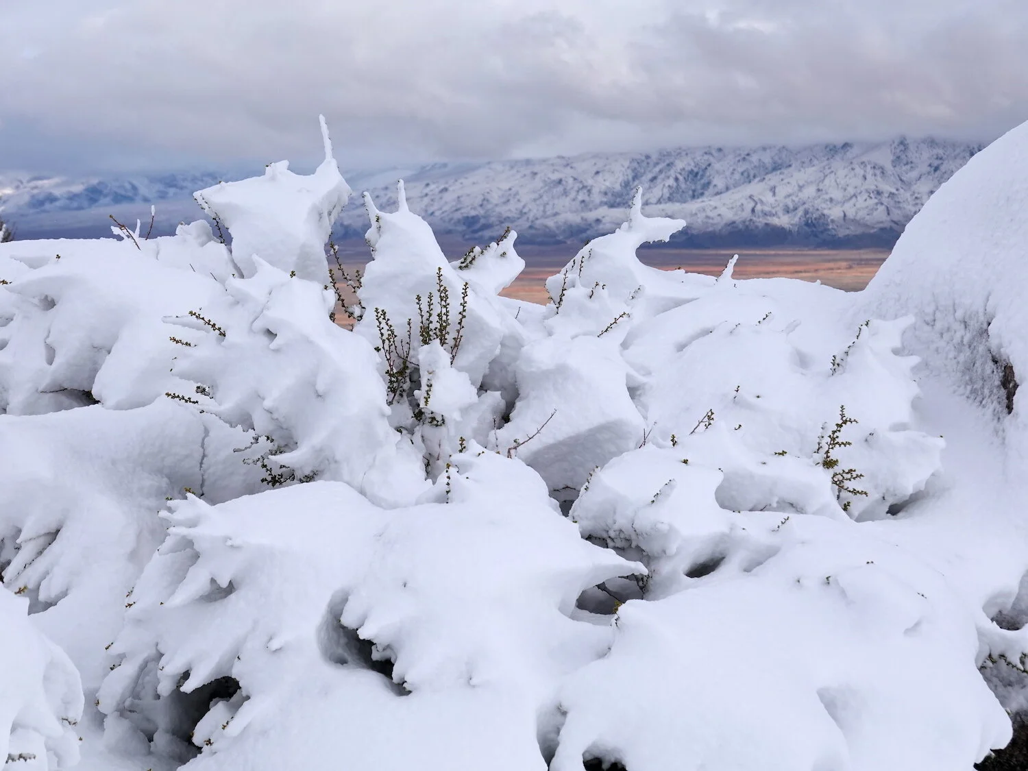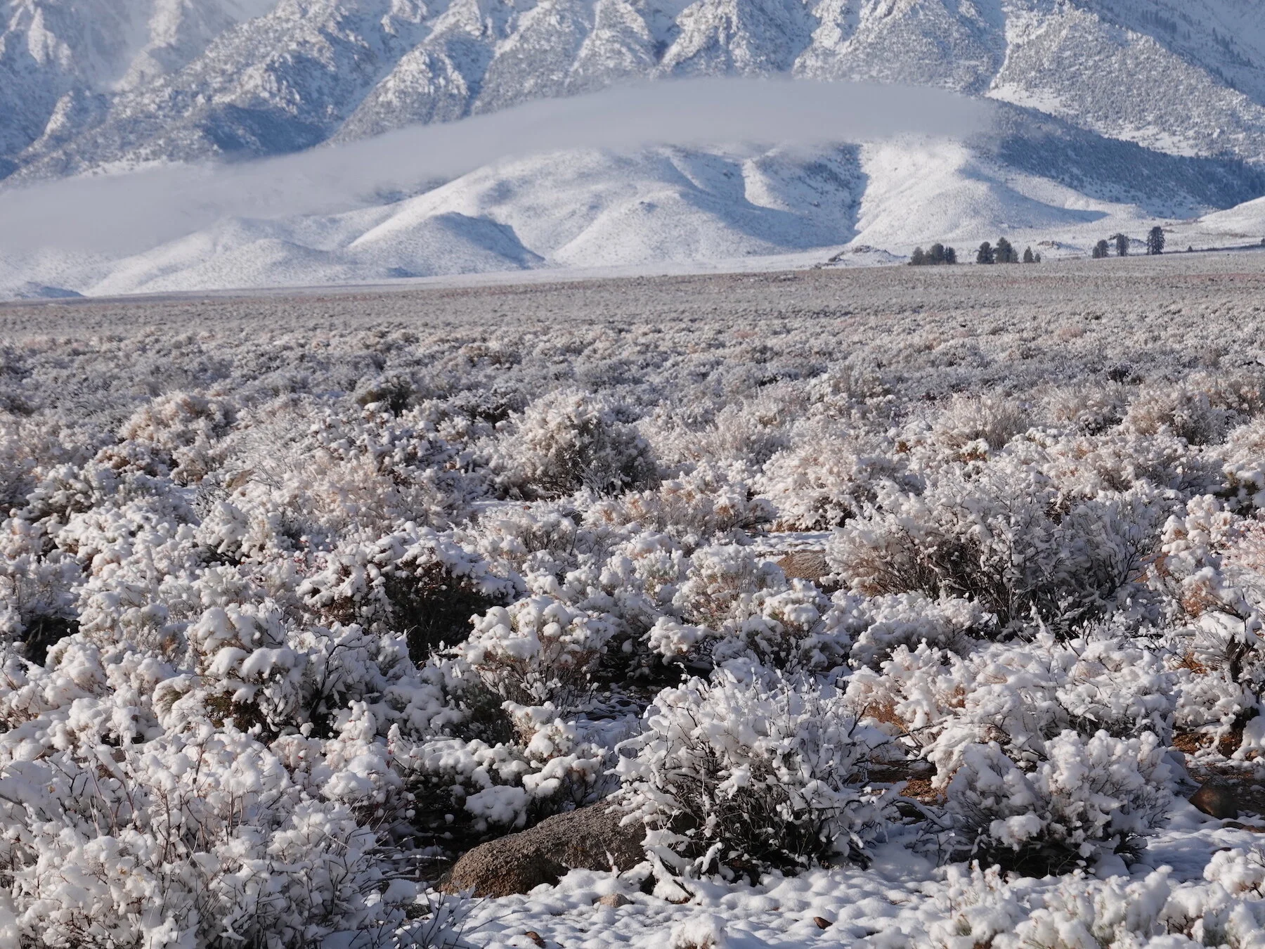 Fresh snow on Sagebrush / low down near the valley floor / snow monster story