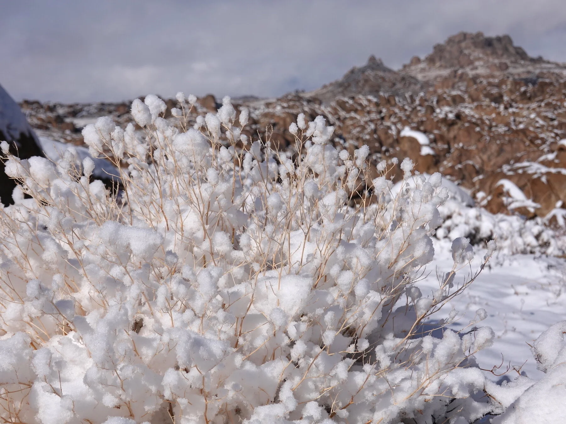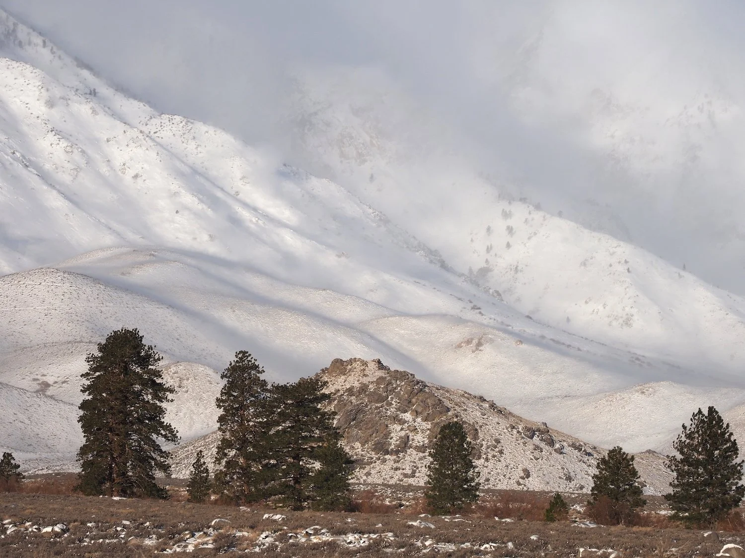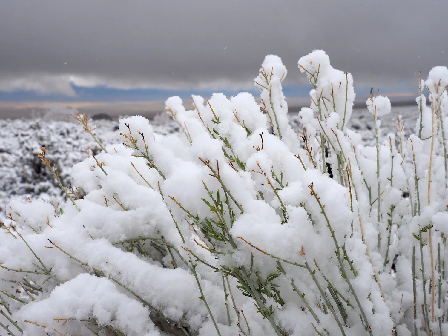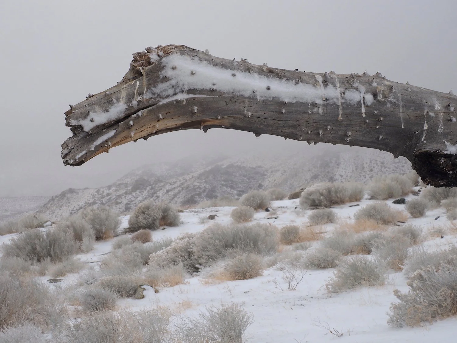 Fresh snow on Sagebrush / low down near the valley floor / snow monster story