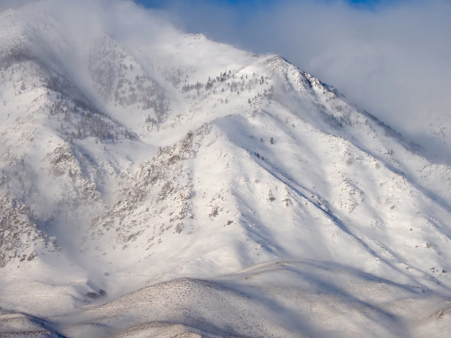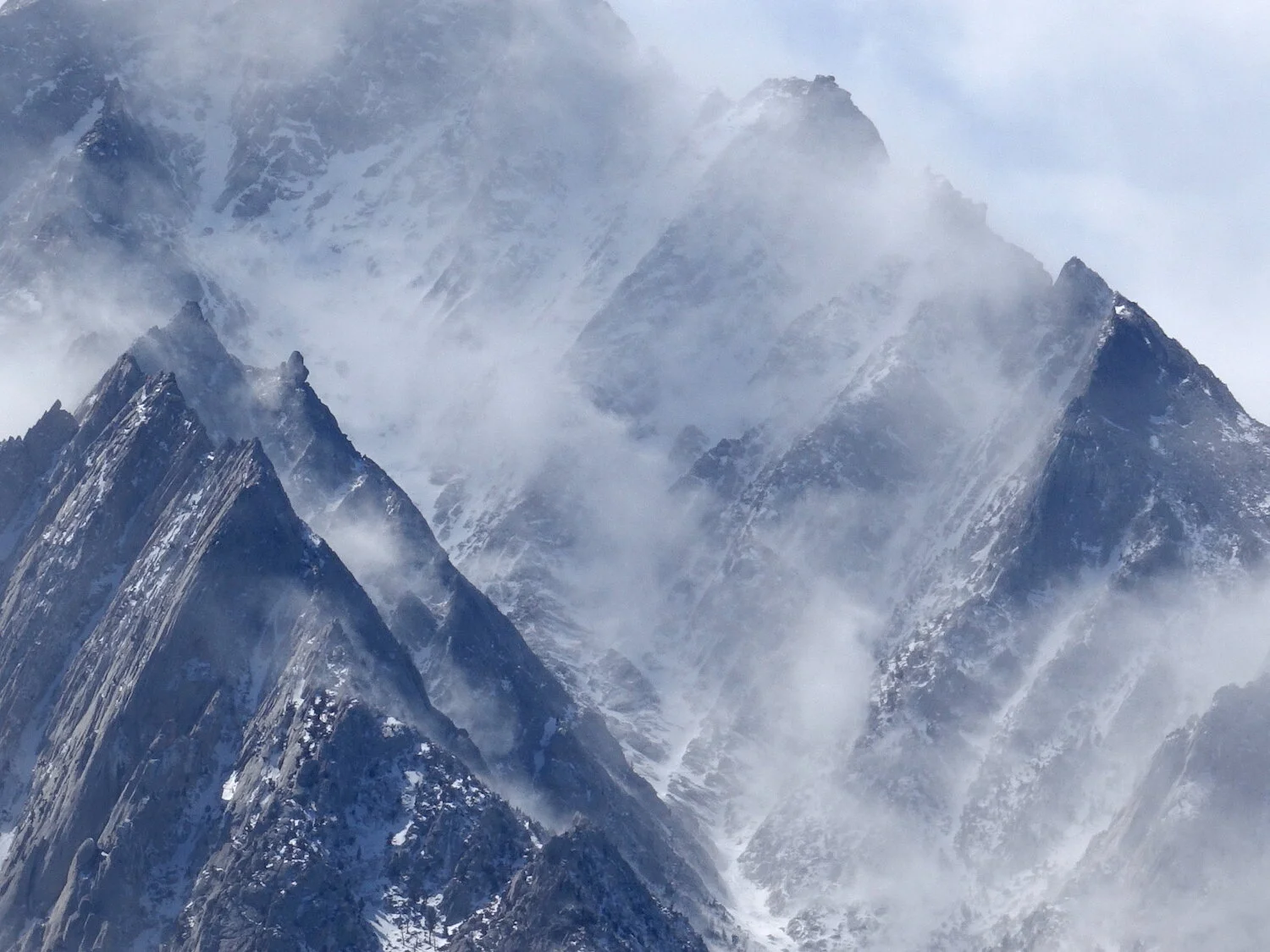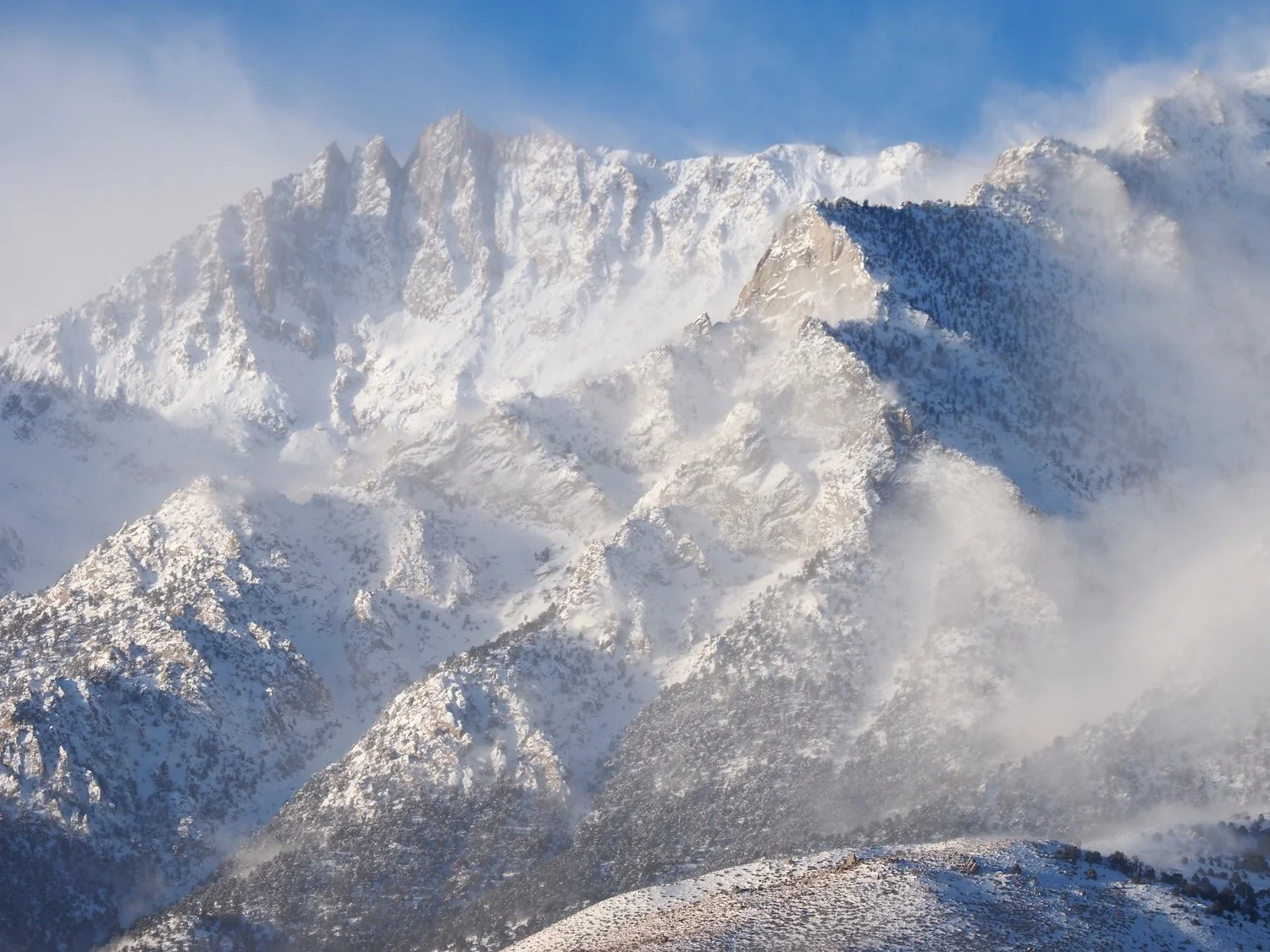 Wind blows around snow / Lone Pine Peak geometry / fog accentuates