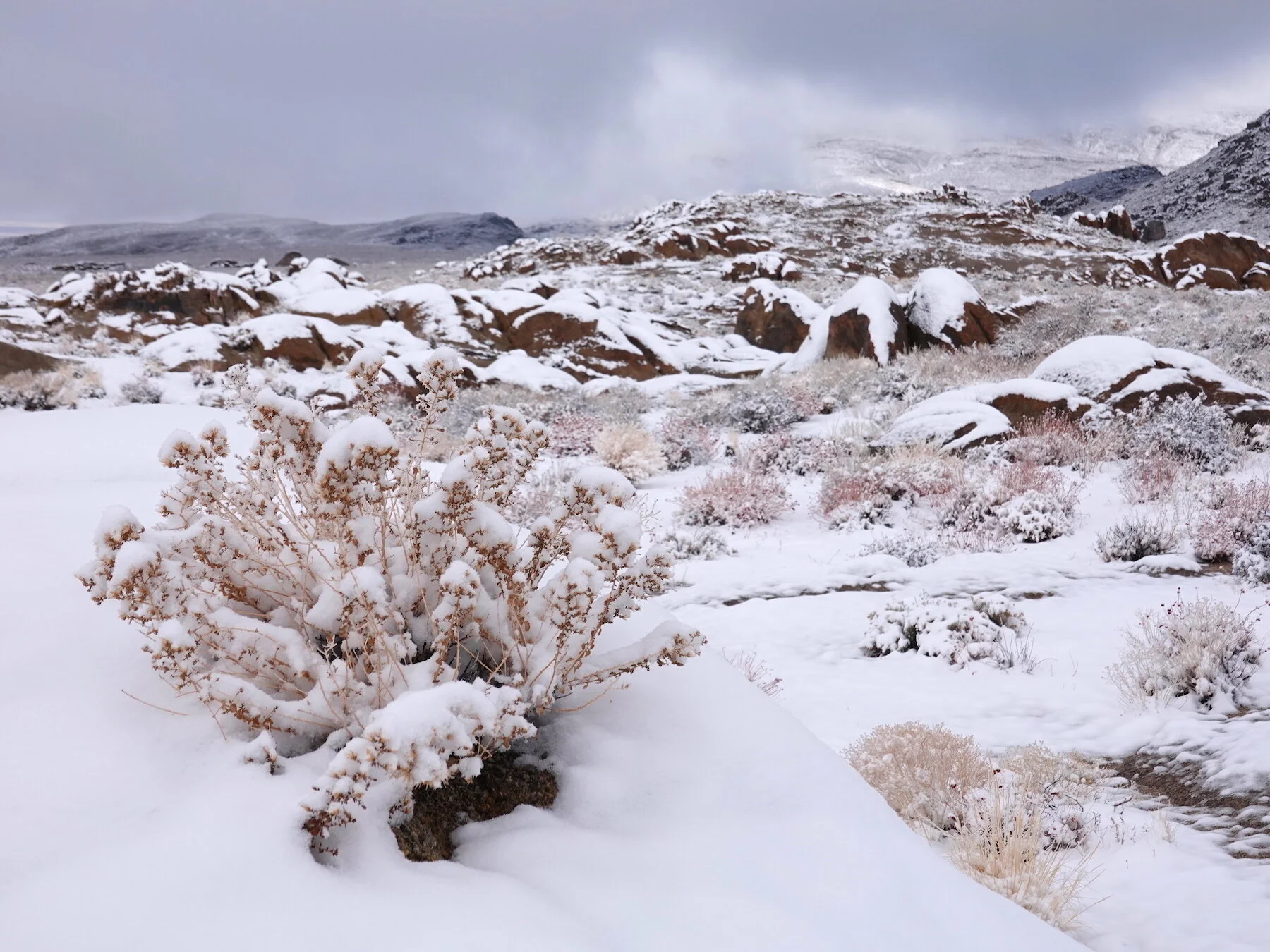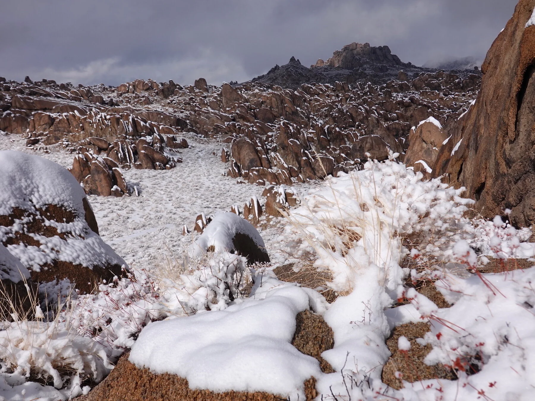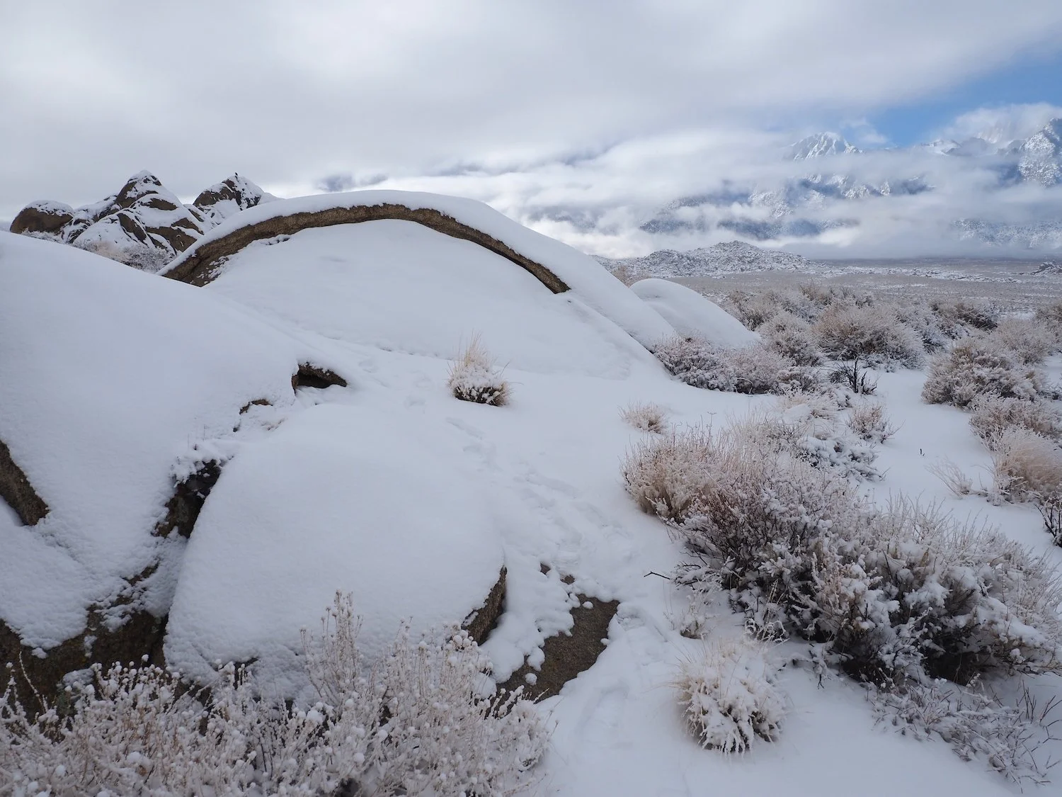 Alabama Hills snow / mild winters and desert plants / just above Lone Pine