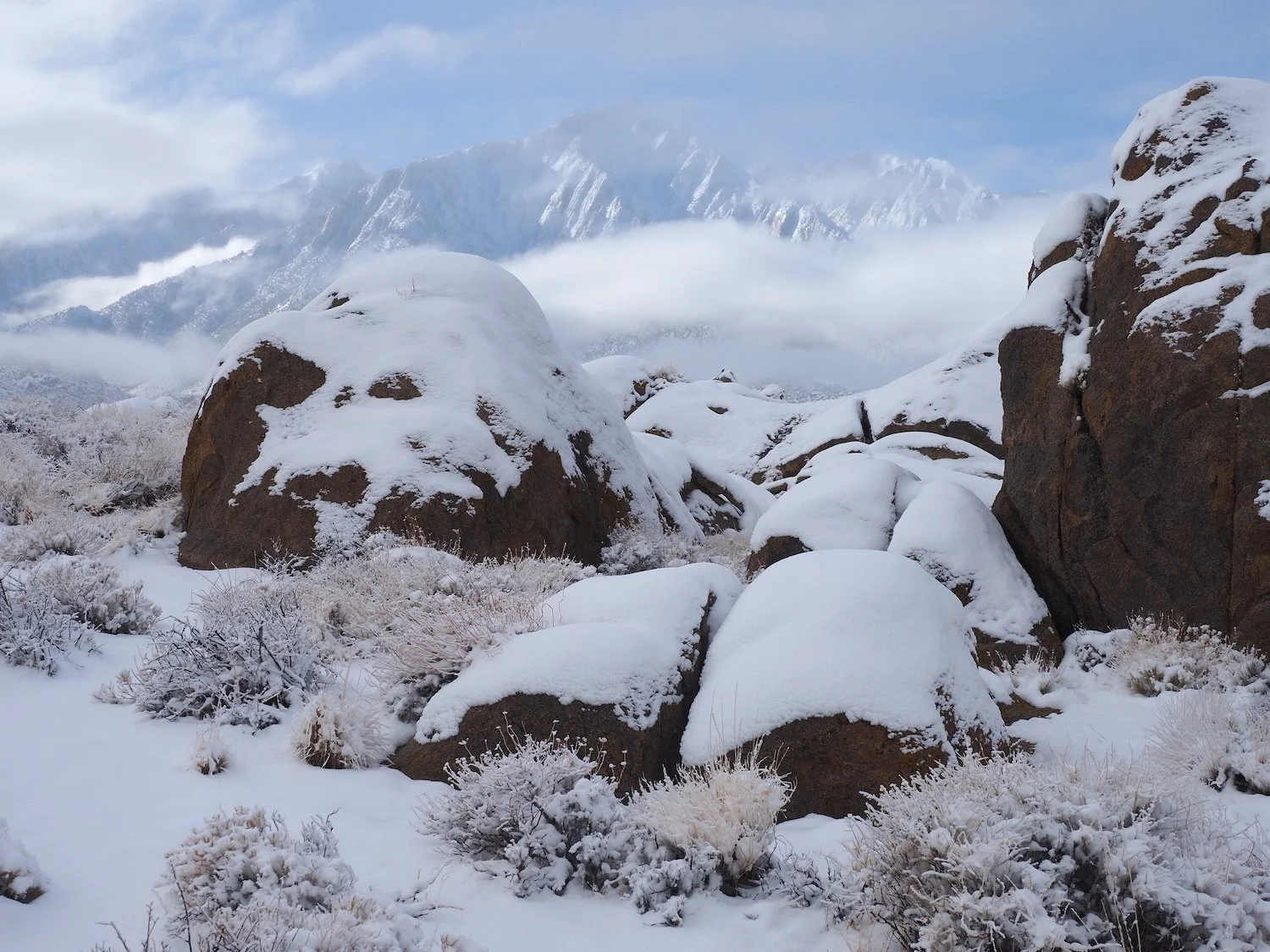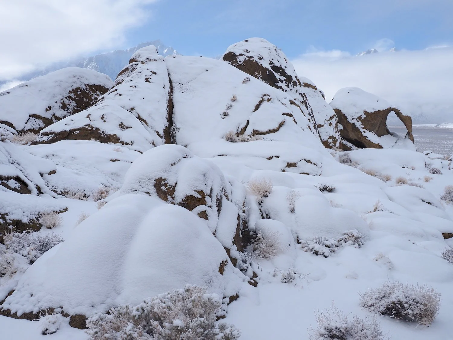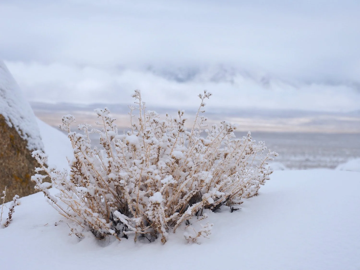 Alabama Hills snow / mild winters and desert plants / just above Lone Pine