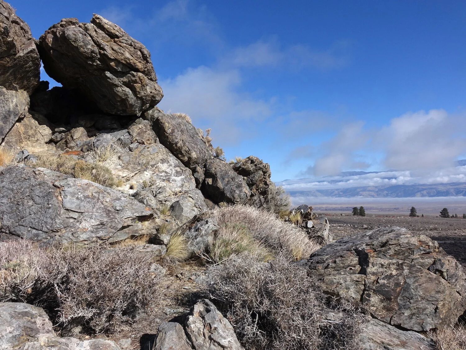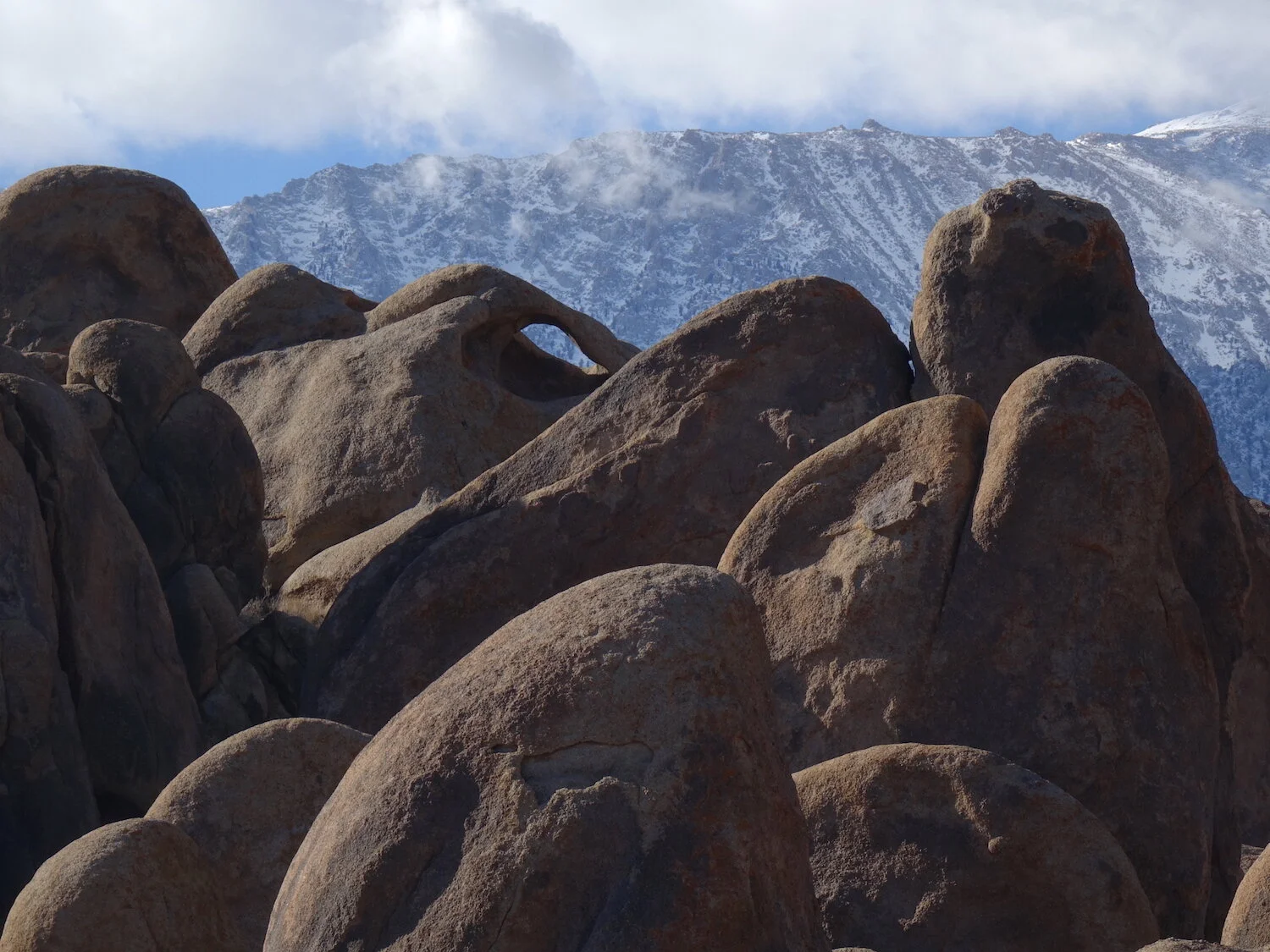 Hard to see window / in the Alabama Hills / clouds above and warm below