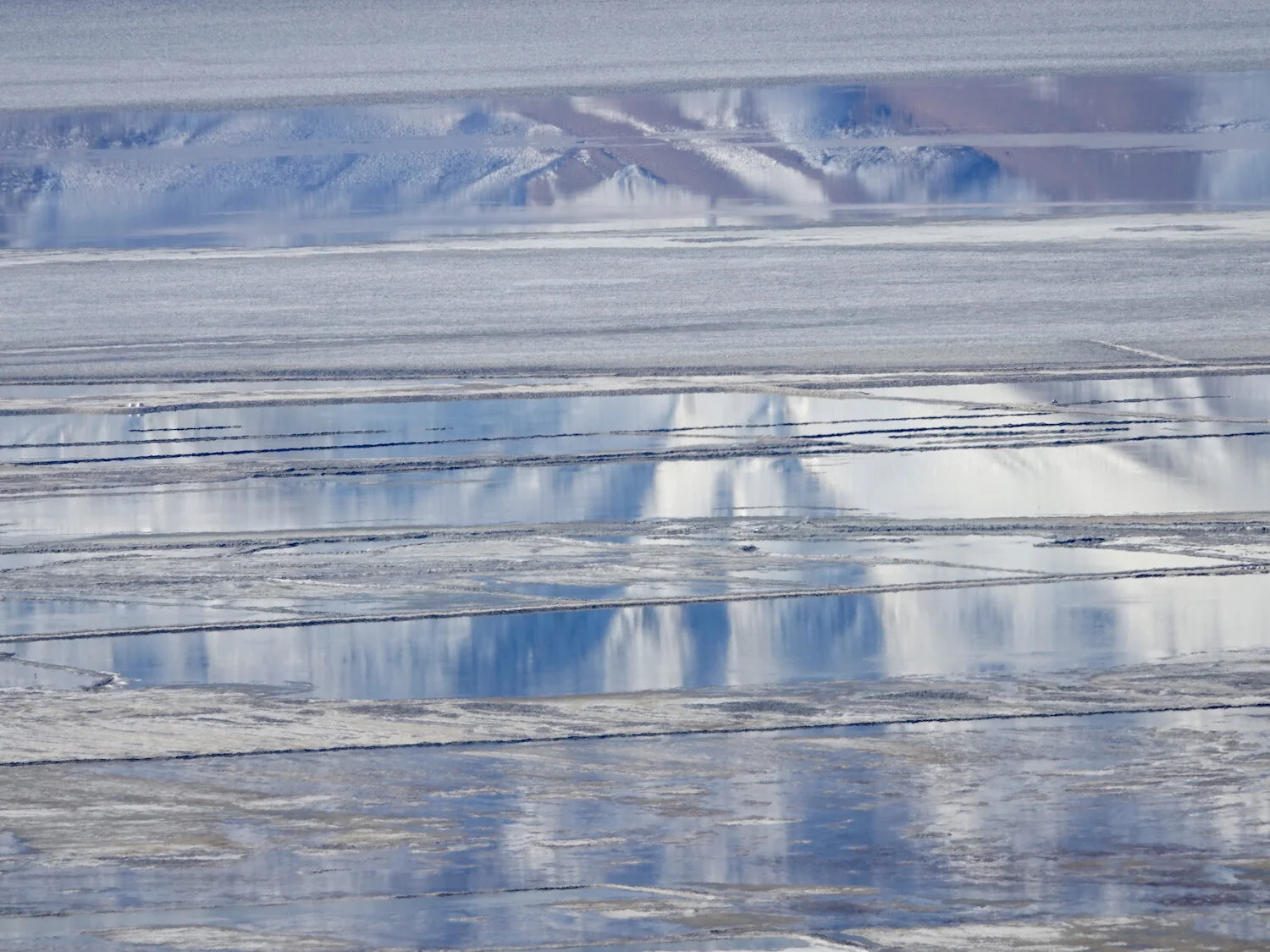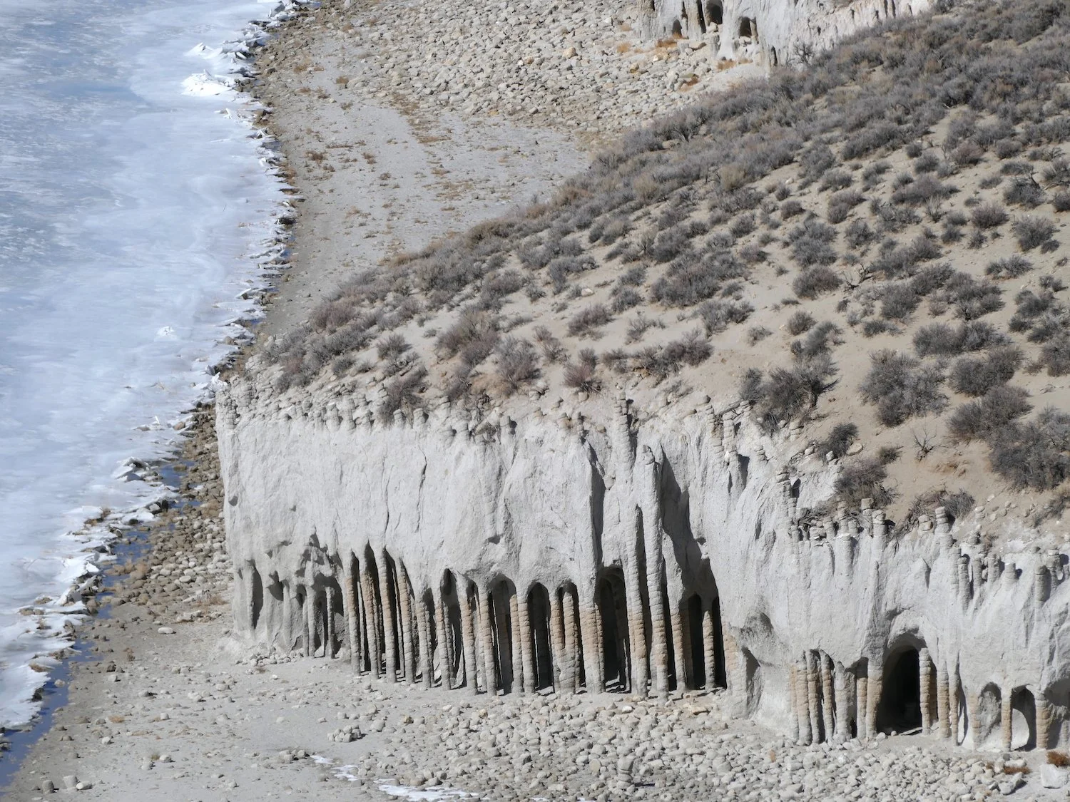 Jagged ice shoreline / tuff columns up in Mono / ice break up begins