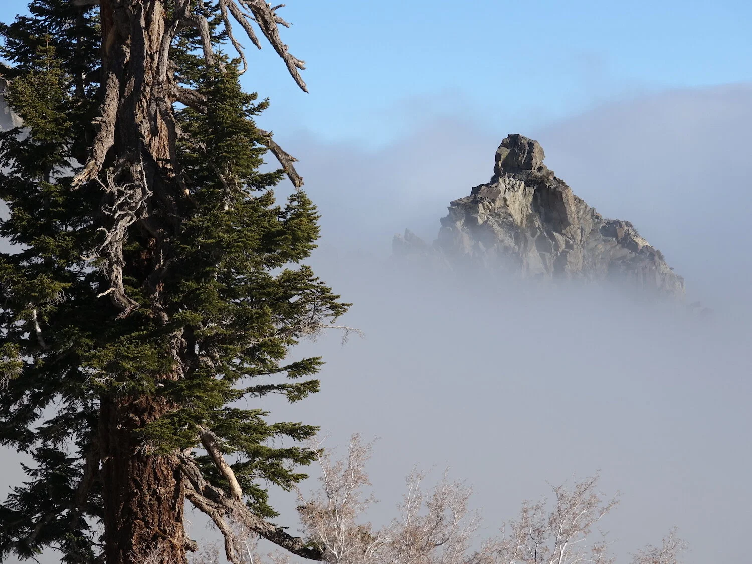 Obscure pinnacle / standing tall in clearing fog / Onion Valley Road