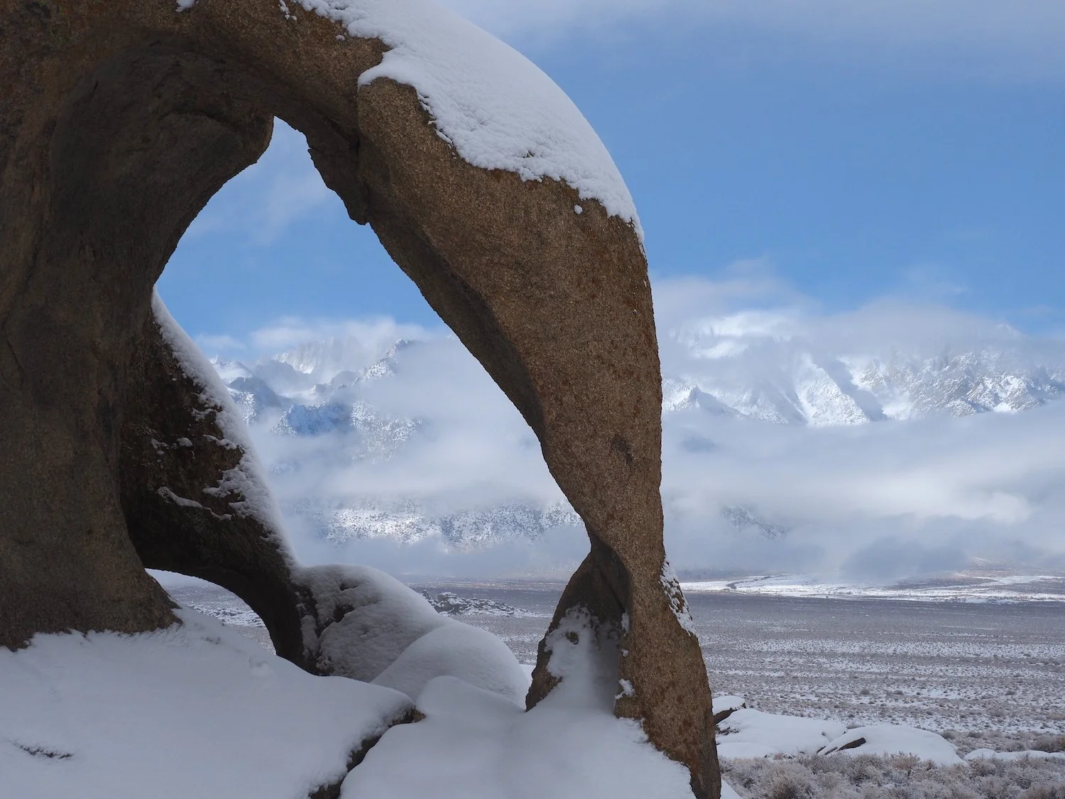 Mount Whitney peaks out / above a granitic arch / a snowstorm clearing